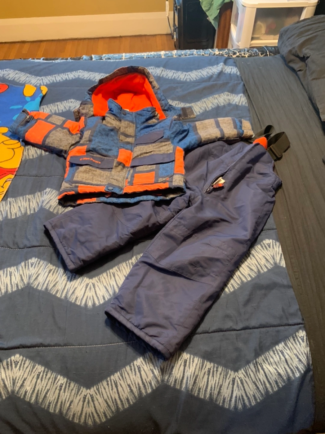 Blue and green plaid ski jacket with orange accents. Matching blue bibs with adjustable straps. Fleece lining in the jacket. $30 EACH SET.