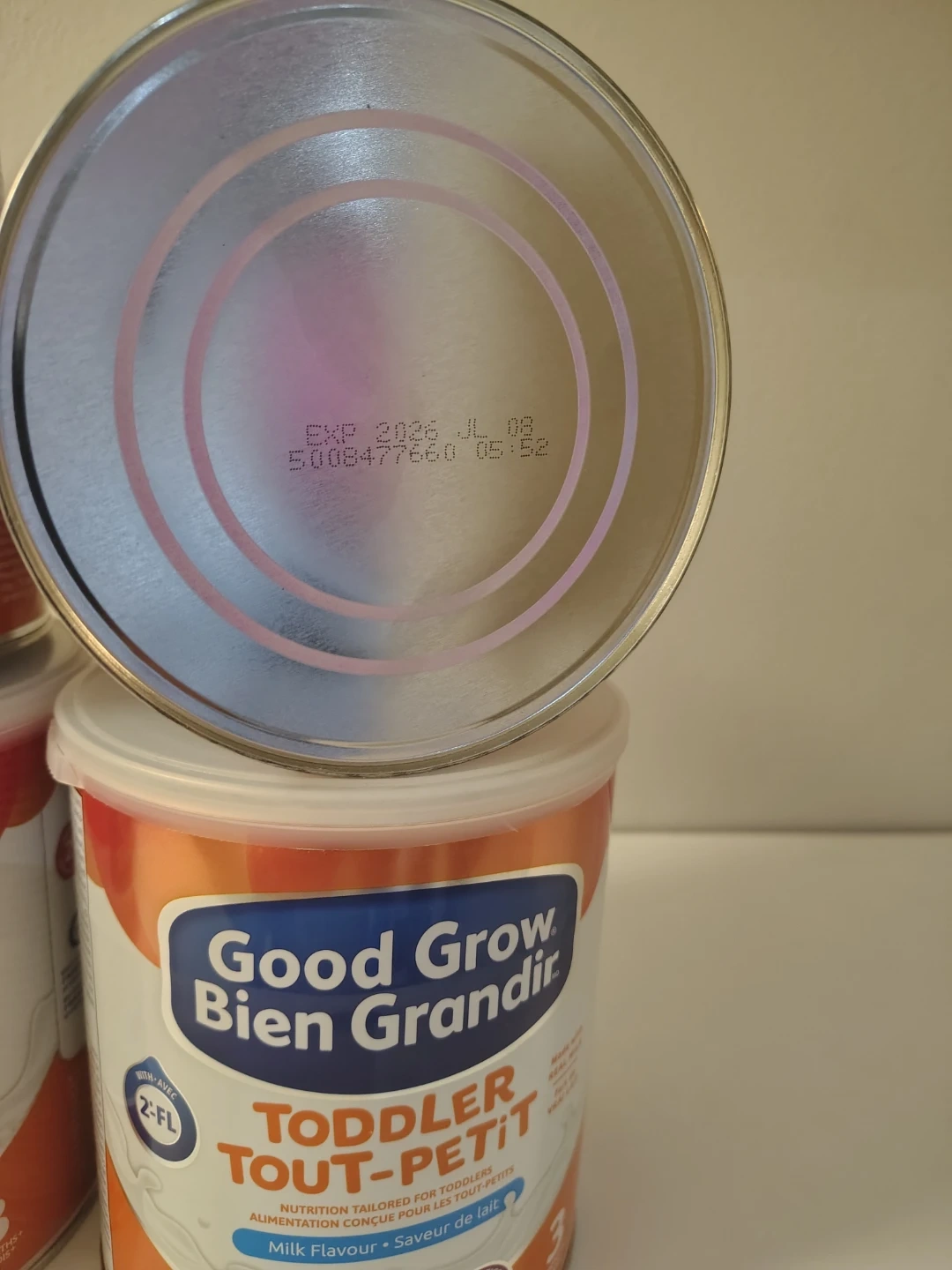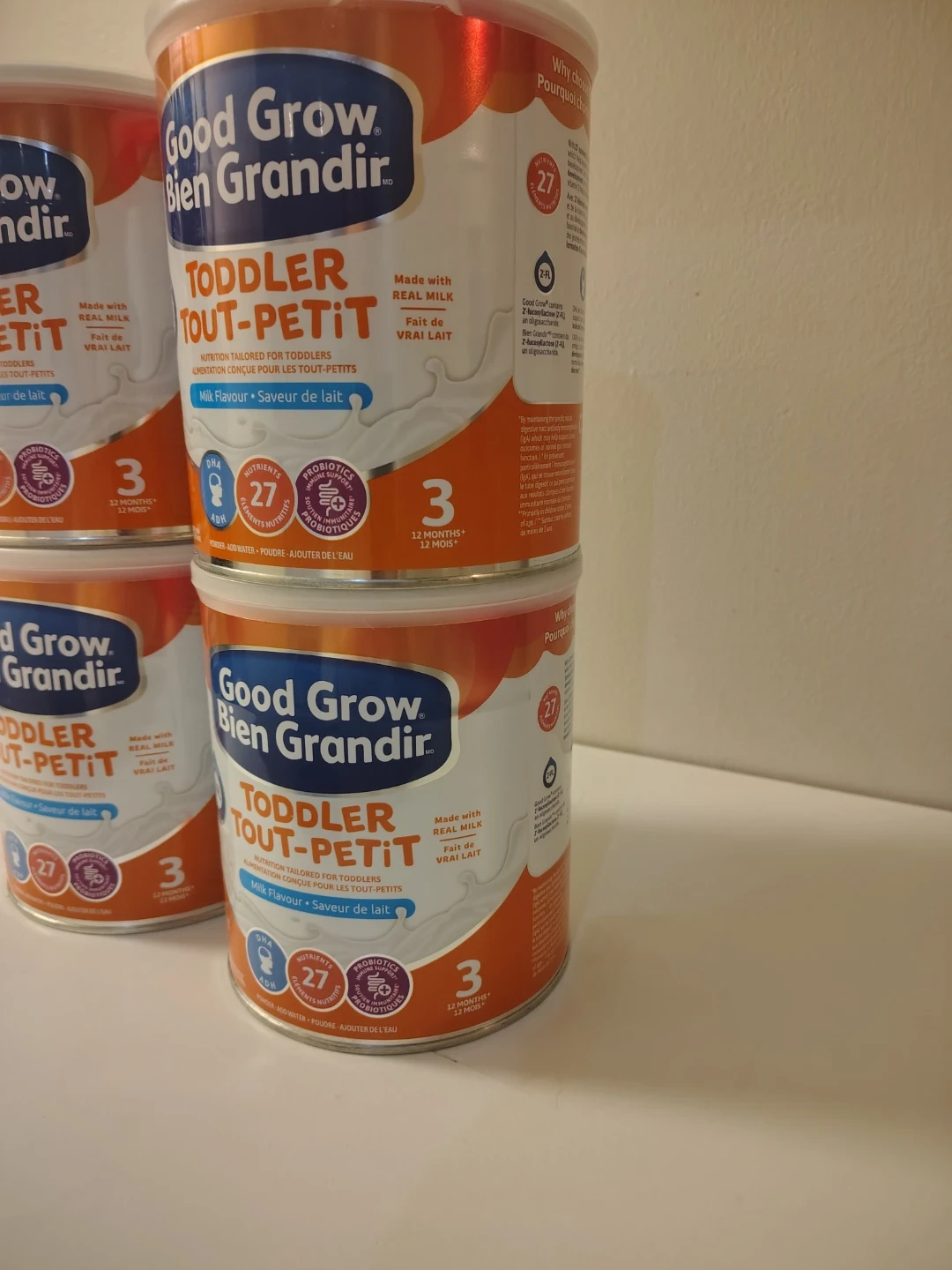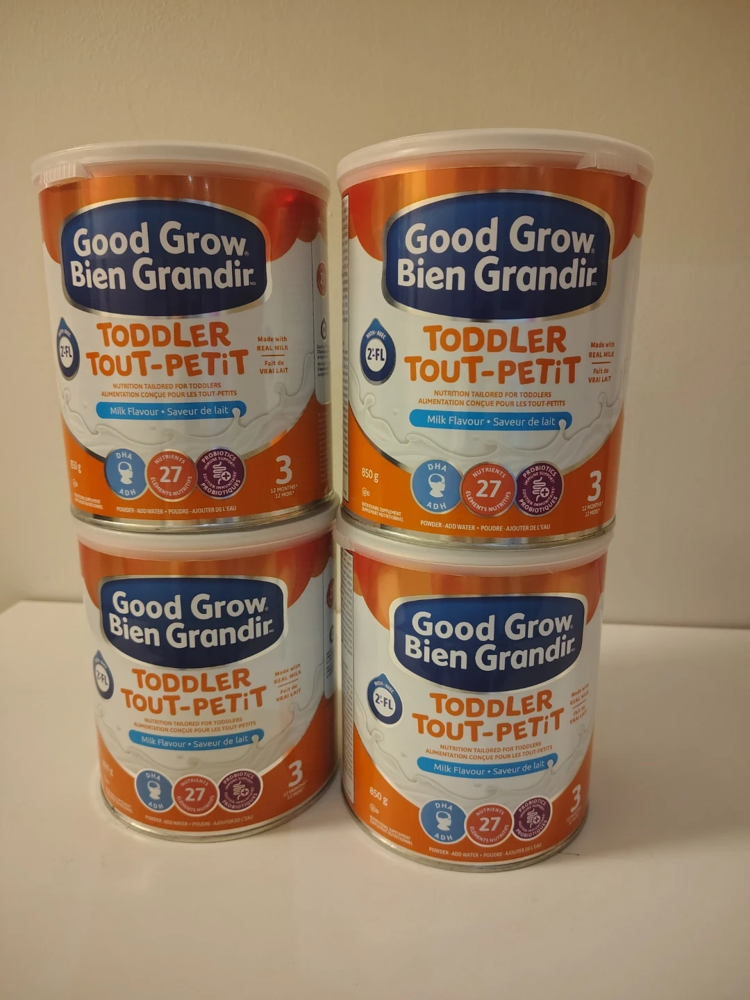 Four cans of Good Grow Bien Grandir toddler milk formula, milk flavour. Each can contains 850g of powder. EXP 2026 JL 08.