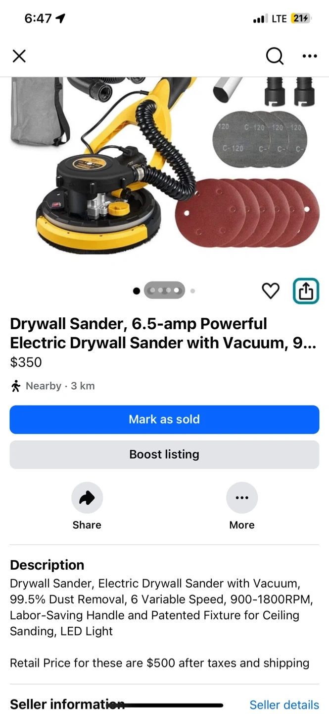 Selling a Goerner's drywall sander. It's a 6.5-amp powerful electric drywall sander with vacuum. It features 99.5% dust removal, 6 variable speeds from 900-1800RPM, a labour-saving handle, and a patented fixture for ceiling sanding with an LED light. The retail price for these is $500 after taxes and shipping. It comes with a box.