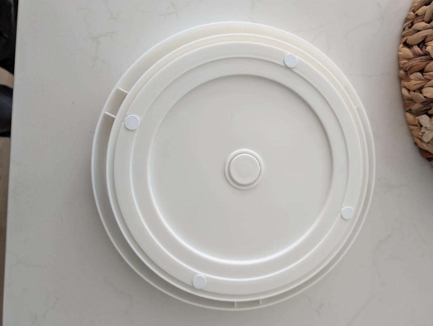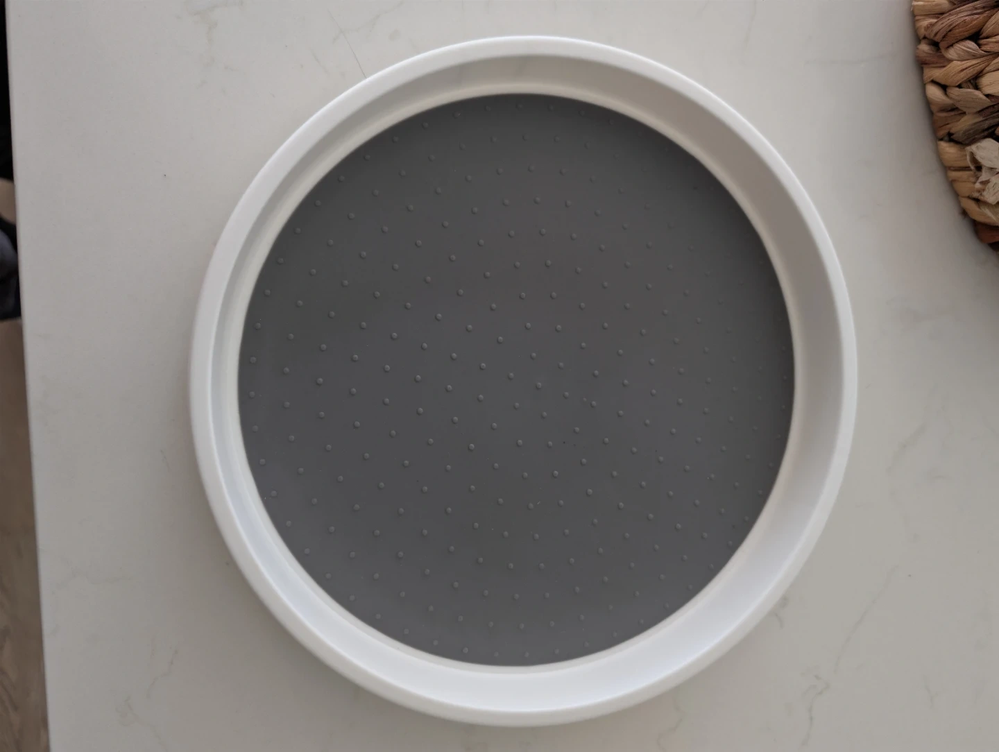 Has a white frame with a gray non-slip mat. Spins smoothly. Great for kitchen, pantry, or bathroom storage