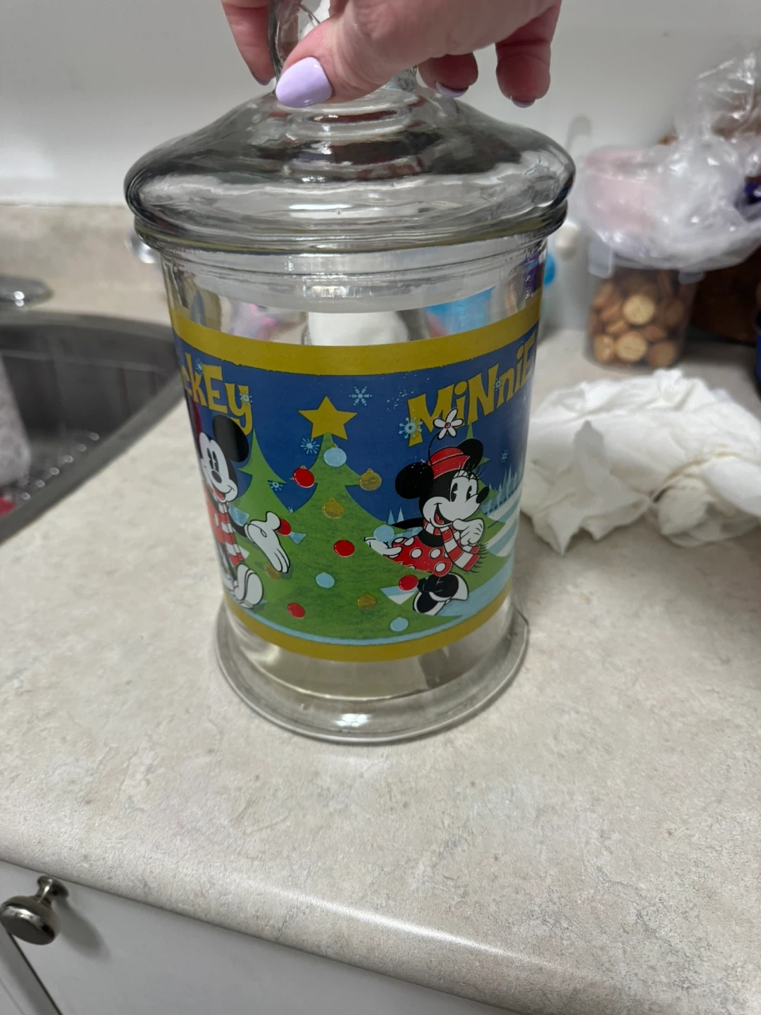 This glass jar features Mickey and Minnie Mouse in a festive Christmas scene.