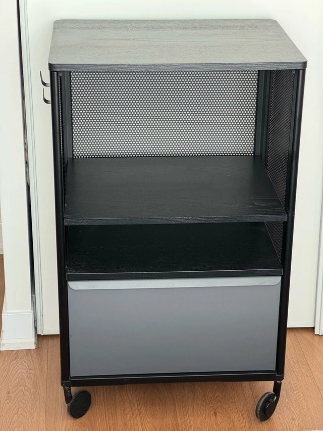 Tuck things away in your office or kitchen with this movable IKEA Bekant Storage Unit on Casters. It features adjustable hooks and a Rothult smart, keyless NFC/RFID lock for drawers. Dimensions are WDH 61x45x101 cm. Pickup in Wellesley & Sherbourne. Cash or e-transfer accepted. Ash veneer drawer and particle board drawer front. Includes floating drawer insert and wheels. Asking $99 or best offer.