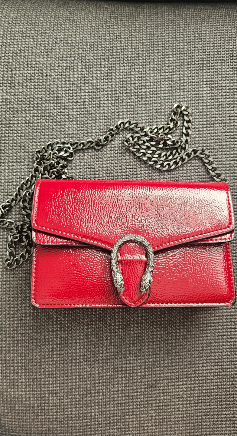 This is a shiny red patent leather wallet with a silver chain strap. It features the distinctive Dionysus tiger head closure. It's a compact size, suitable for carrying essentials.