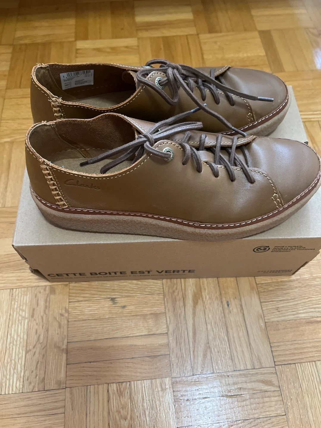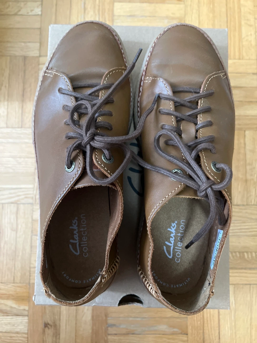 These Clarks Collection shoes are made of genuine brown leather with a classic lace-up design. The stitching details add a nice touch to the overall look. They're comfortable for everyday wear.