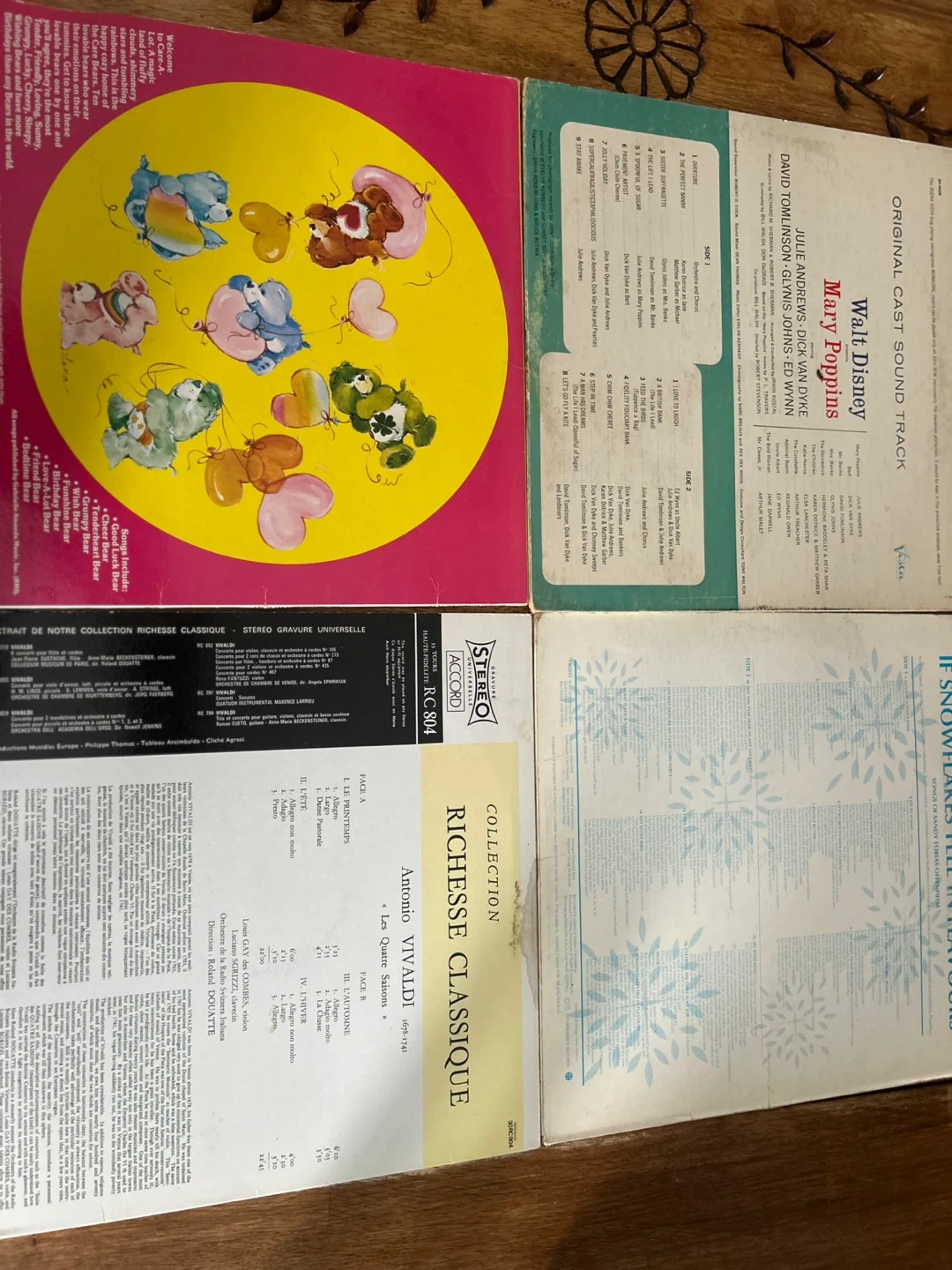 This lot includes four vinyl records. Two are children's oriented: 'Care Bears' and 'Walt Disney's Mary Poppins Original Cast Sound Track'. The other two are classical music: 'Vivaldi' and 'If Snowflakes Fell in Flurries'. Records are in sleeves. Great for collectors!