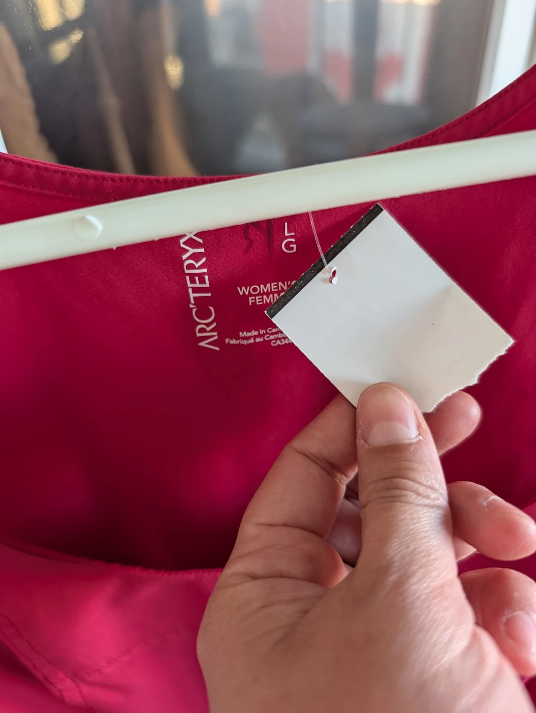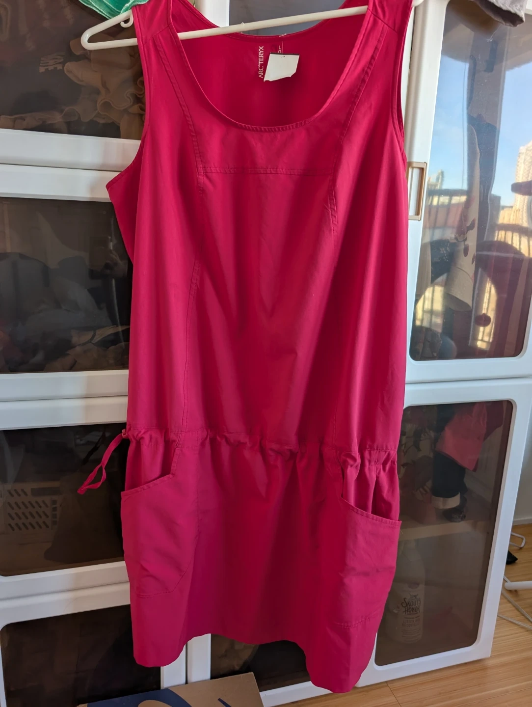 This is an Arc'teryx sleeveless dress in a bright pink colour. It features a drawstring waist for a customizable fit and convenient pockets. Made in Canada.