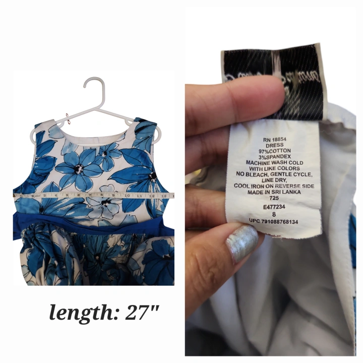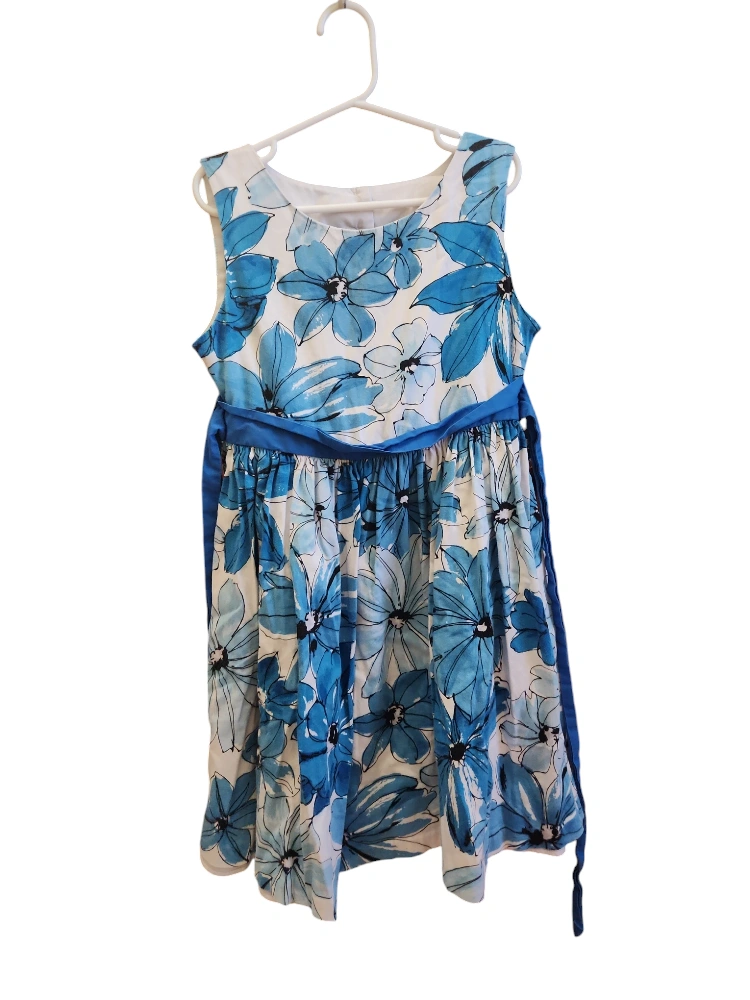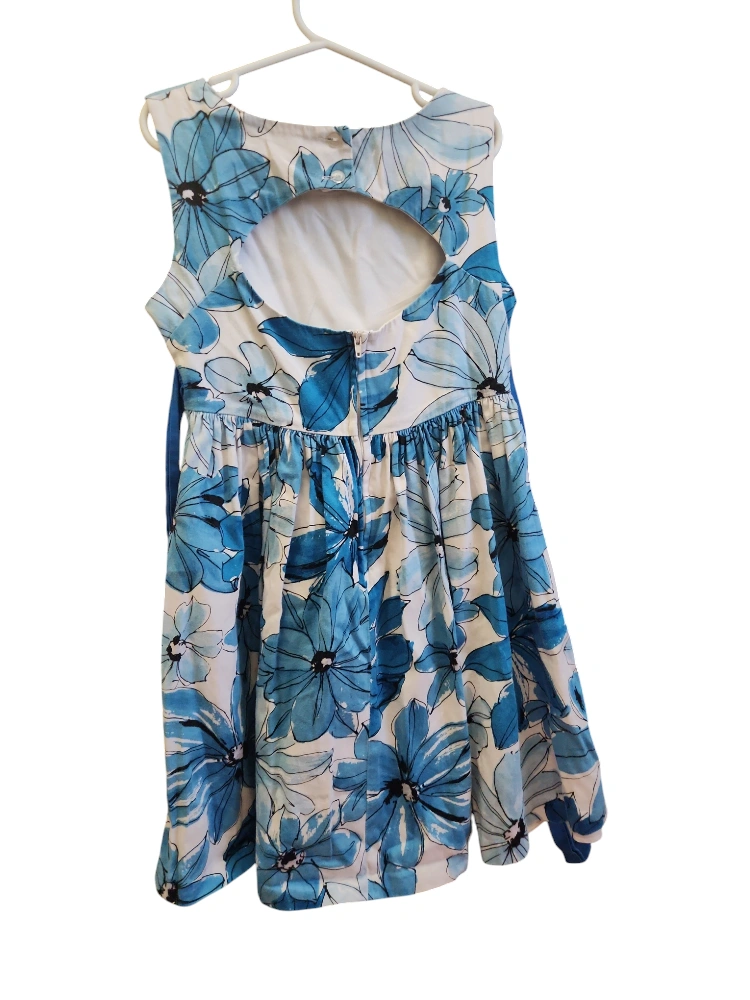 Sleeveless blue and white floral dress with a blue sash. Open back with button closure. Size 5T.