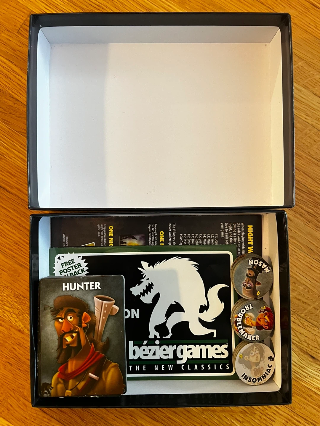 This is the One Night Ultimate Werewolf tabletop game by Bézier Games, a fast game for 3-10 players in which everyone gets a role: One of the dastardly Werewolves, the tricky Troublemaker, the helpful Seer, or one of a dozen different characters, each with a special ability. In the course of a single morning, your village will decide who is a werewolf...because all it takes is catching one werewolf to win!