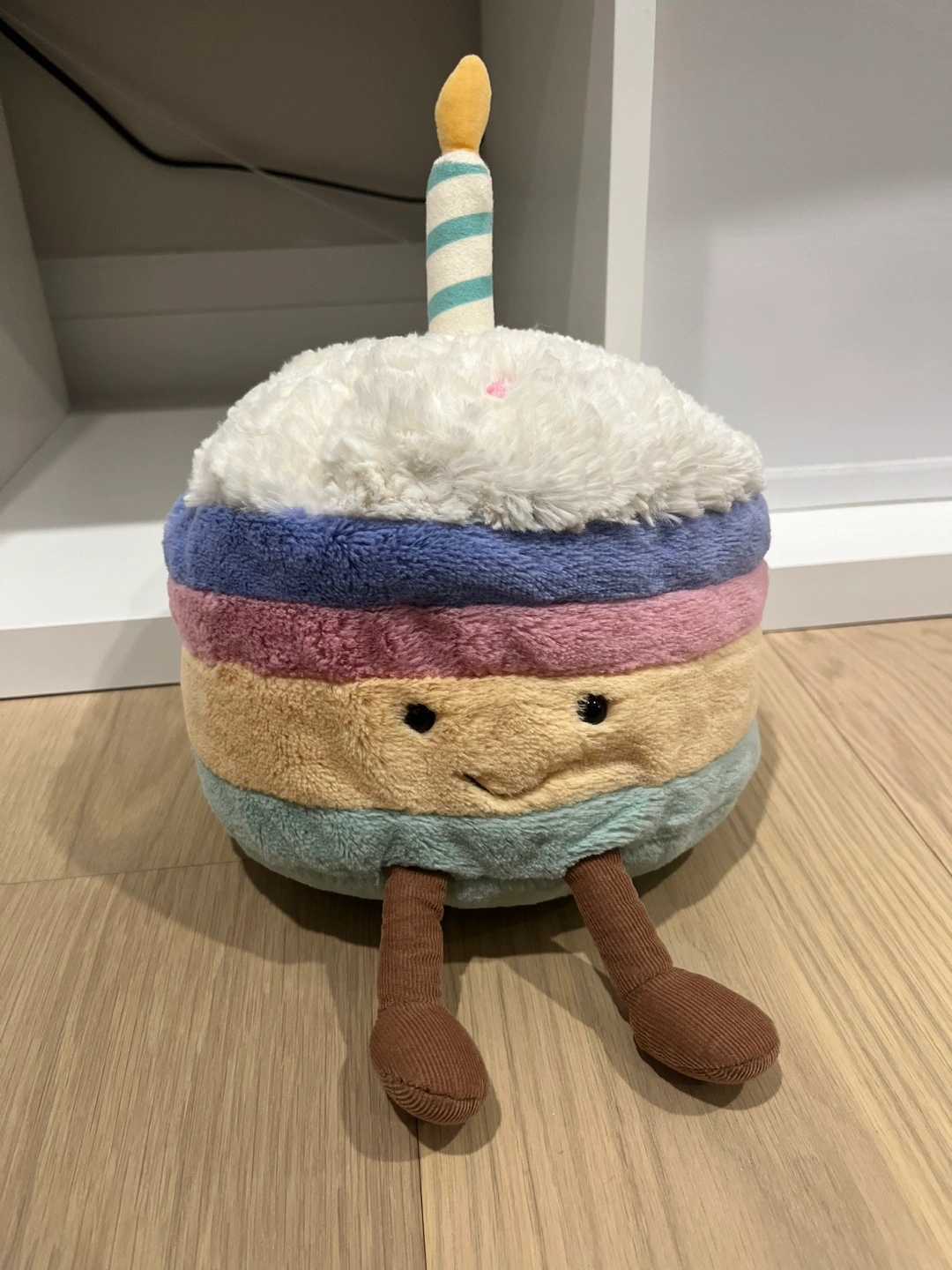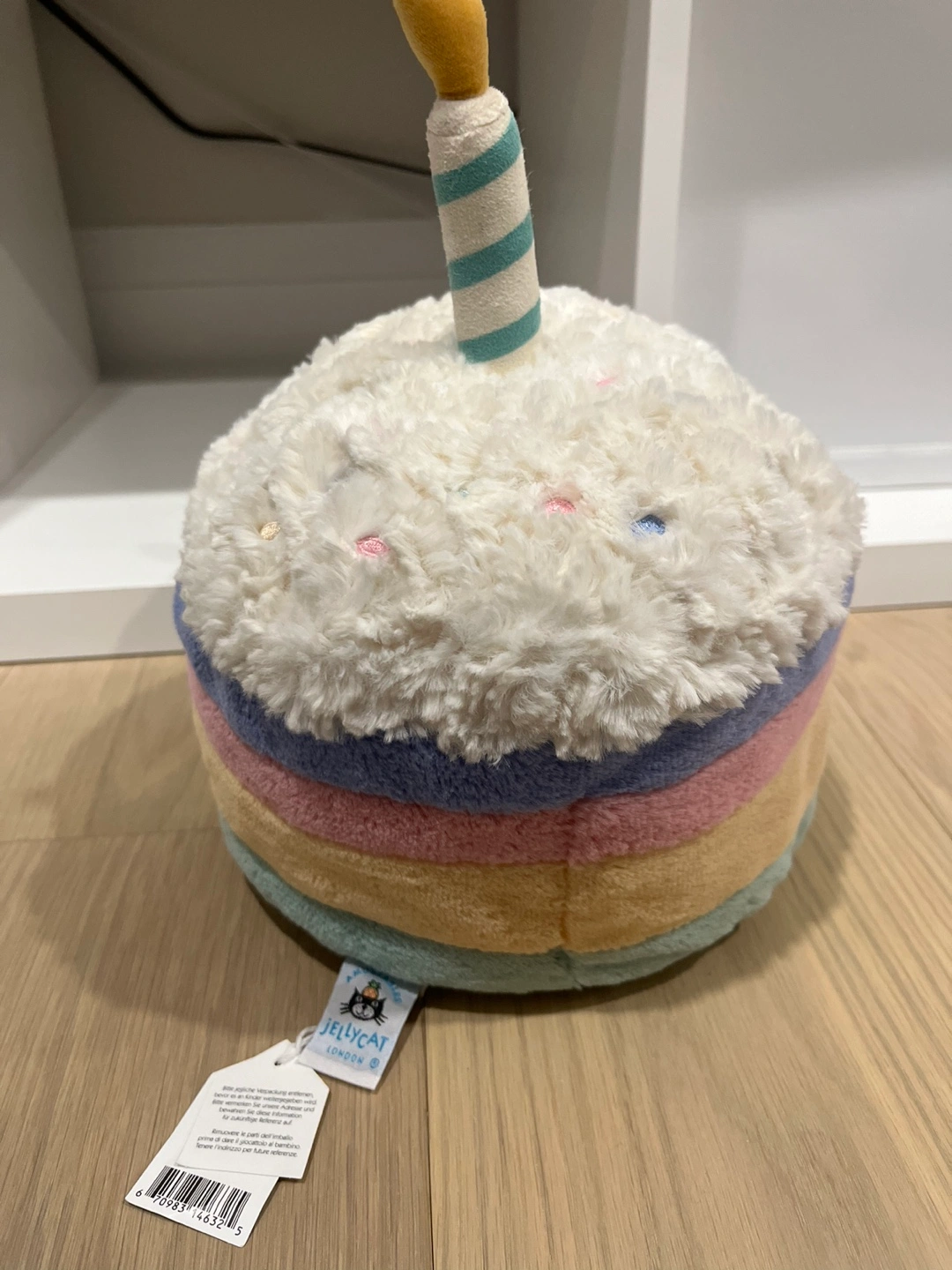 Adorable Jellycat plush toy. Shaped like a layered birthday cake. Features a lit candle on top. Soft and cuddly. Perfect for a child's birthday or a collector.