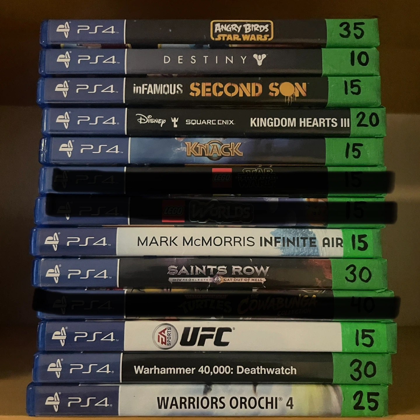 Selling a lot of PS4 games. Not looking to sell entire collection for cheap. Check out the titles in the pictures, prices are marked on green tape. If buying 2 or more, you’ll get $5 off EACH game.