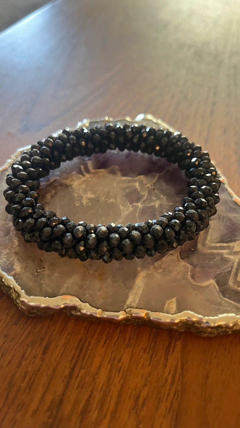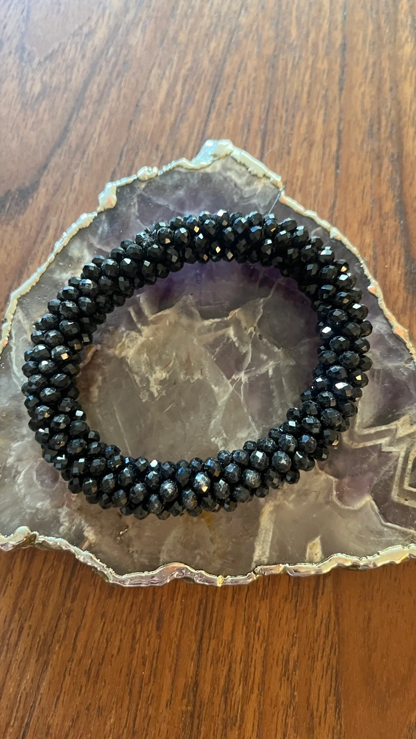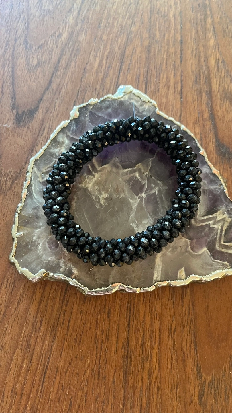 Elegant black beaded bracelet. Stretchy design. Perfect for everyday wear or special occasions. Looks great stacked with other bracelets.