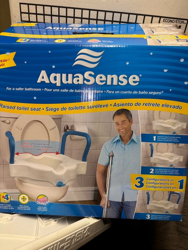 I'm offering an AquaSense raised toilet seat, designed for safer bathroom use. This seat provides added height and stability, making it easier and more comfortable for individuals with mobility issues to use the toilet. Here are some features: * Adds 4 inches of height * Tool-free installation * Easy to clean