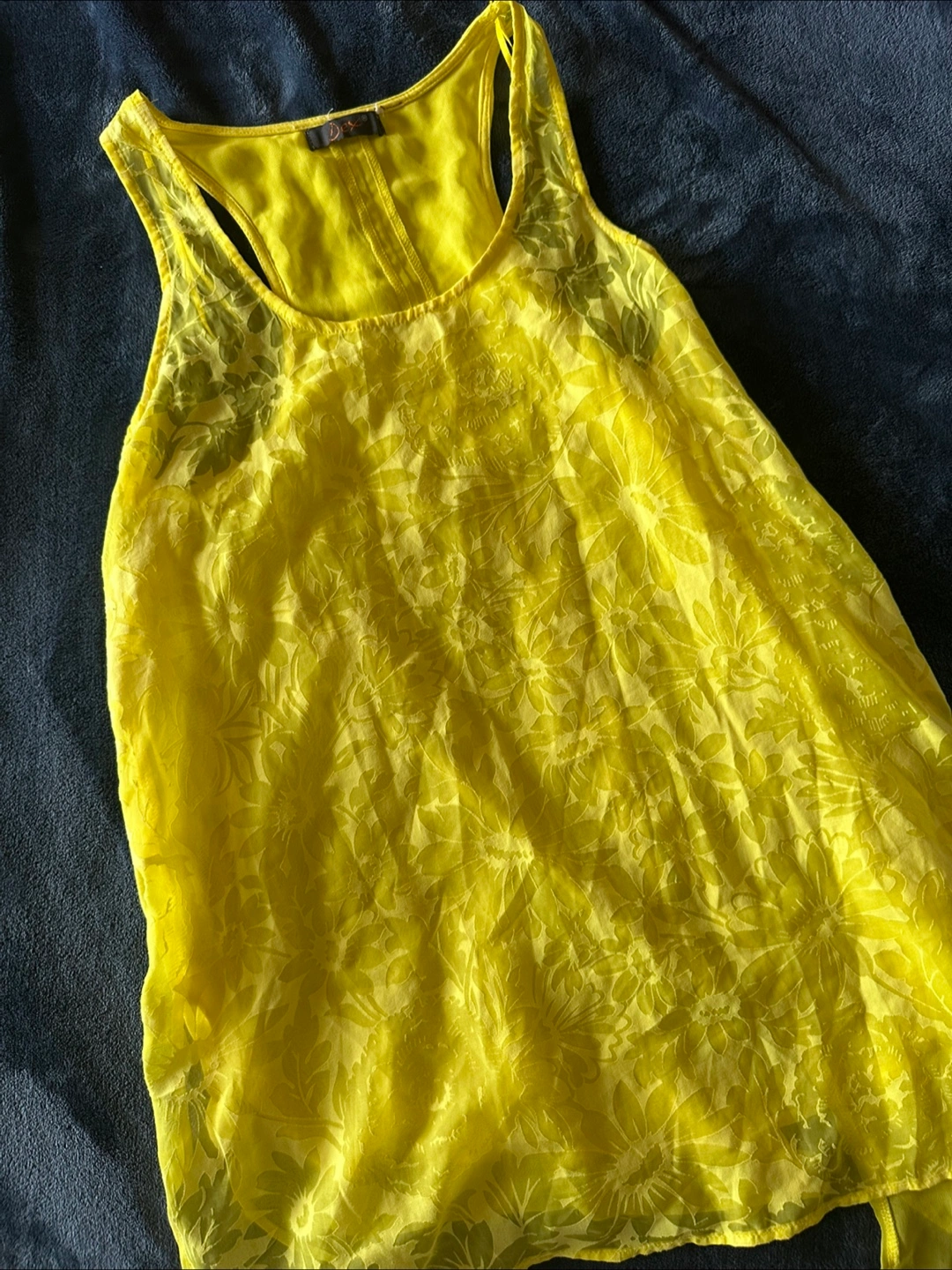 Lightweight, sheer yellow tank top. Racerback style. Floral pattern. Layered look. Size small. Never worn