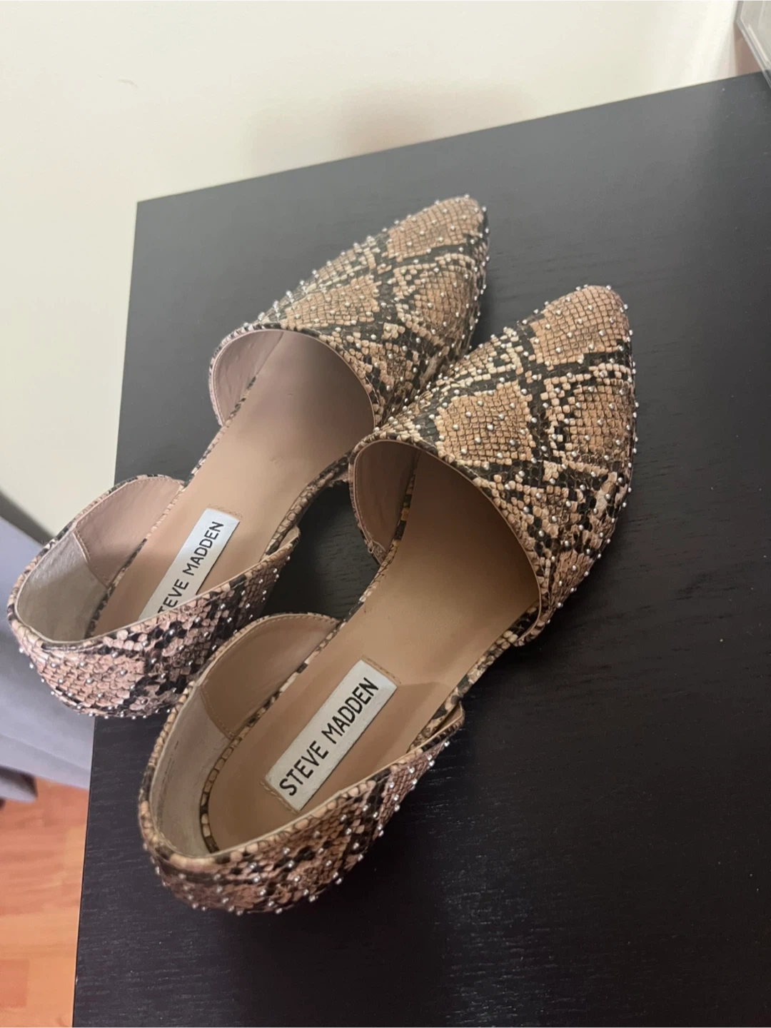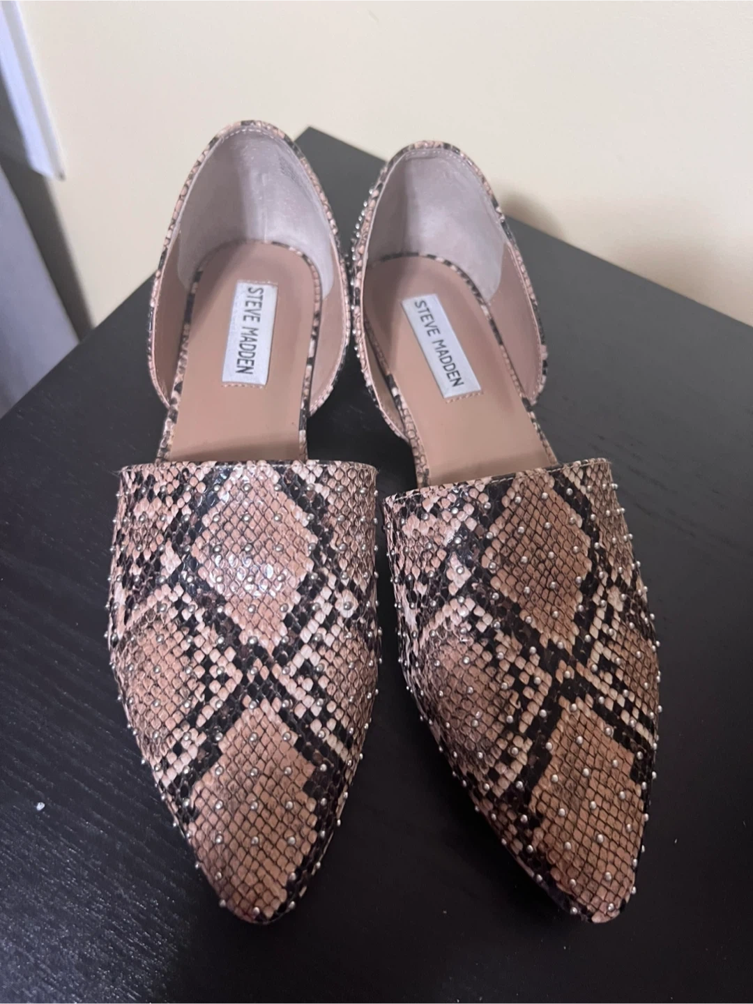 These Steve Madden flats have a unique snakeskin pattern and a pointed toe design. They're in great condition and ready for a new home! Perfect for adding a touch of style to any outfit