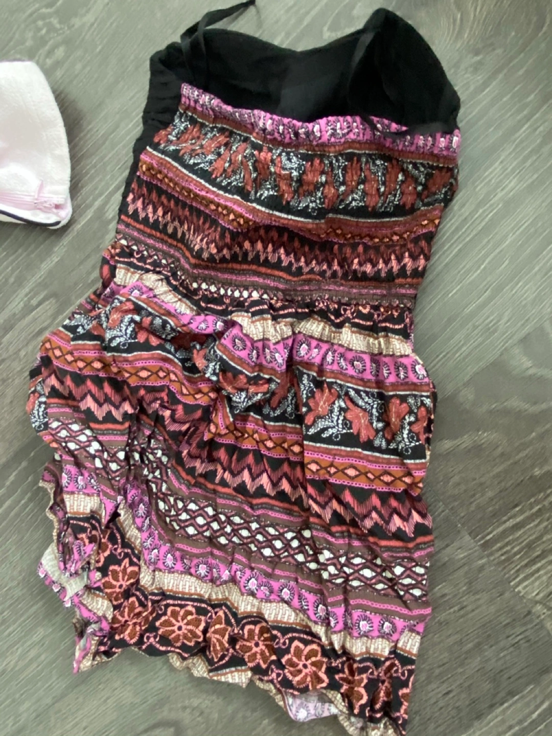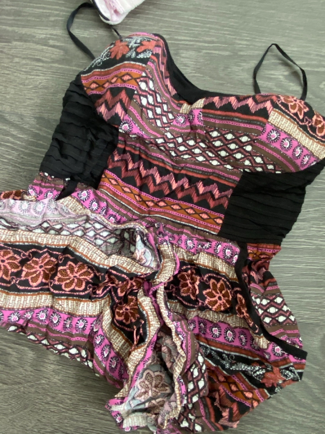 Strapless mini jumpsuit with a colourful, geometric pattern in a paisley print. Size XS. Has a built-in bra and adjustable straps.