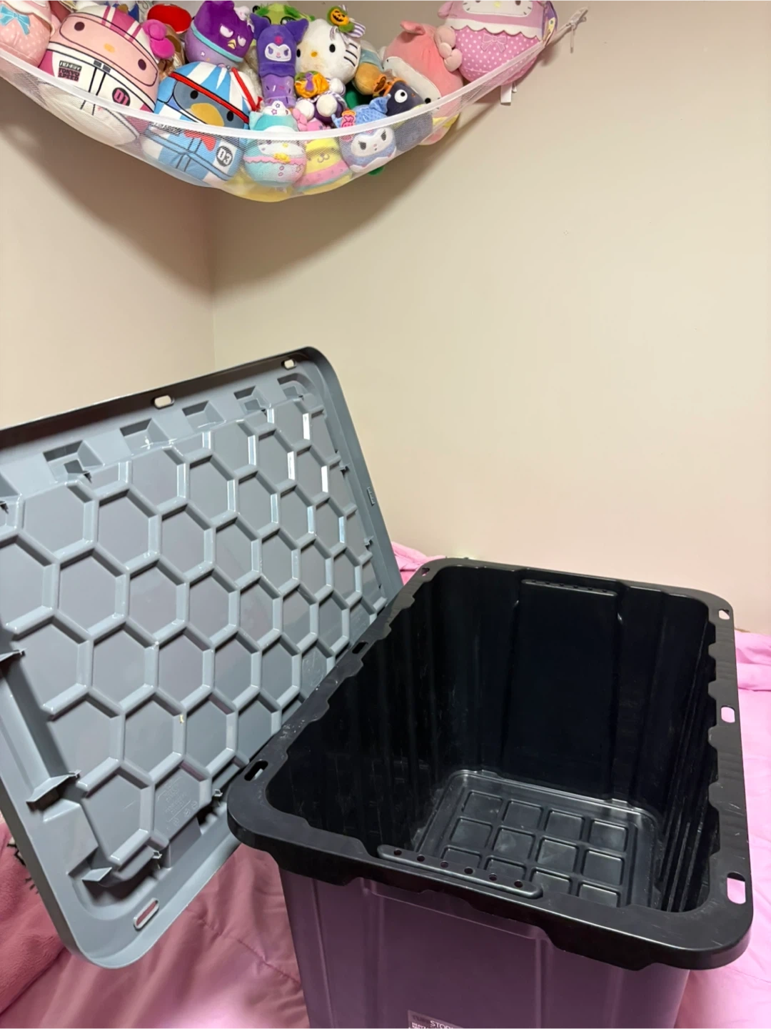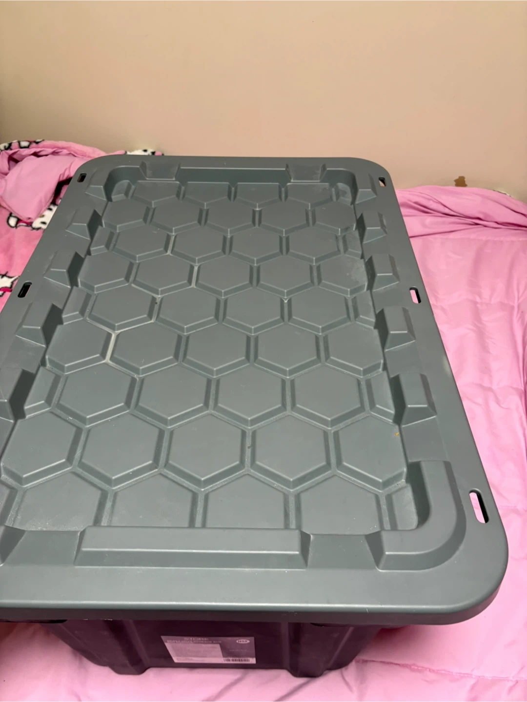 This is a TuffStore 102 litre heavy-duty storage box with a lid. It's made of durable plastic and features sturdy ergonomic handles for easy carrying. The lid has a honeycomb design for added strength and allows for secure stacking. It's suitable for use in the garage or home storage. This box is great for keeping your belongings organized and protected!