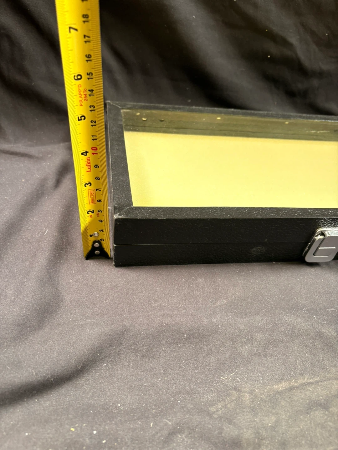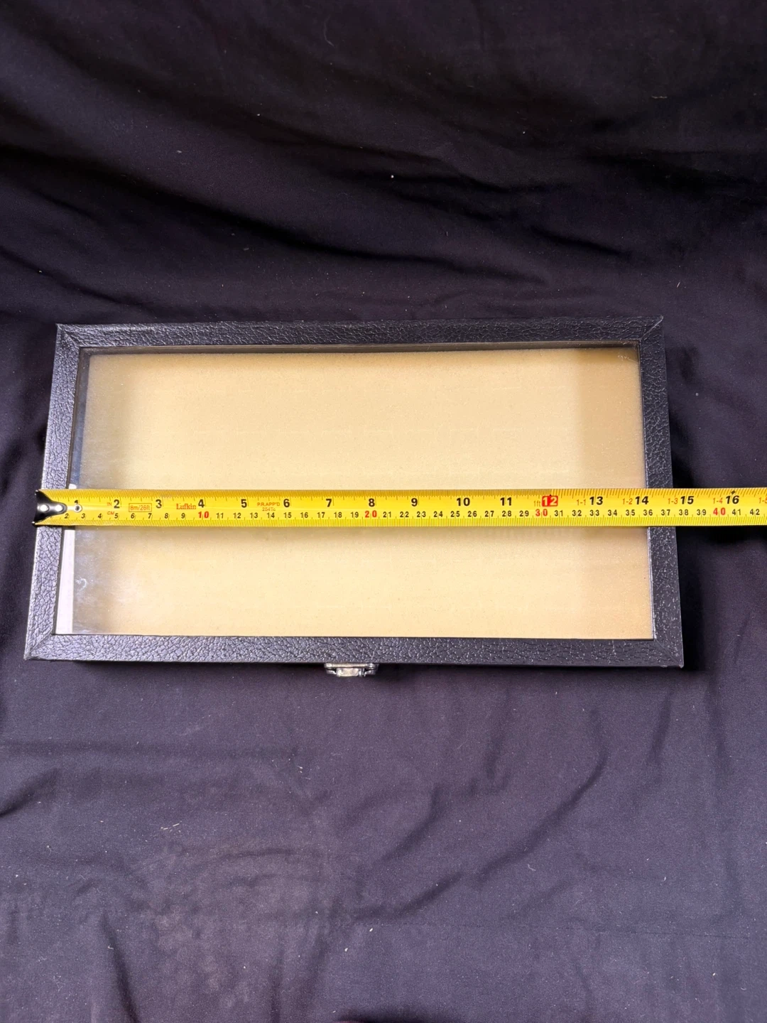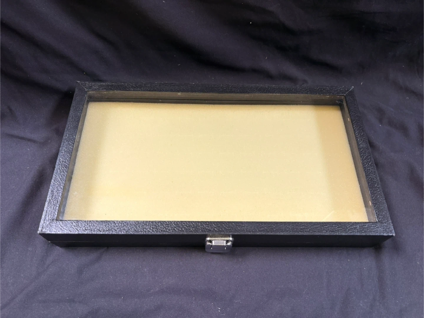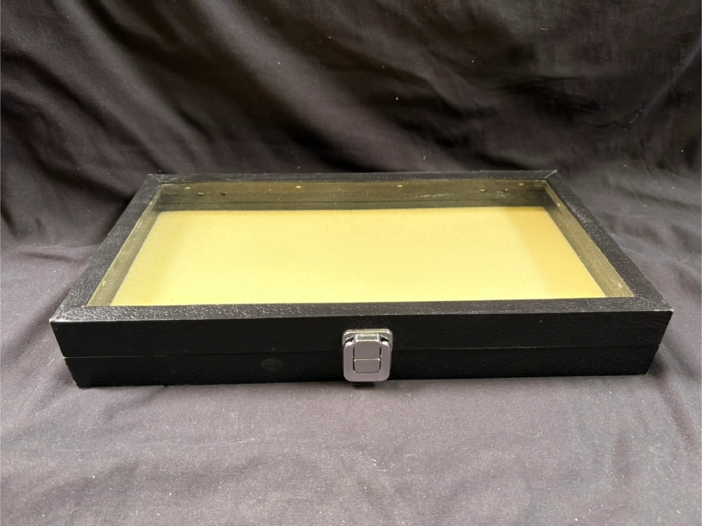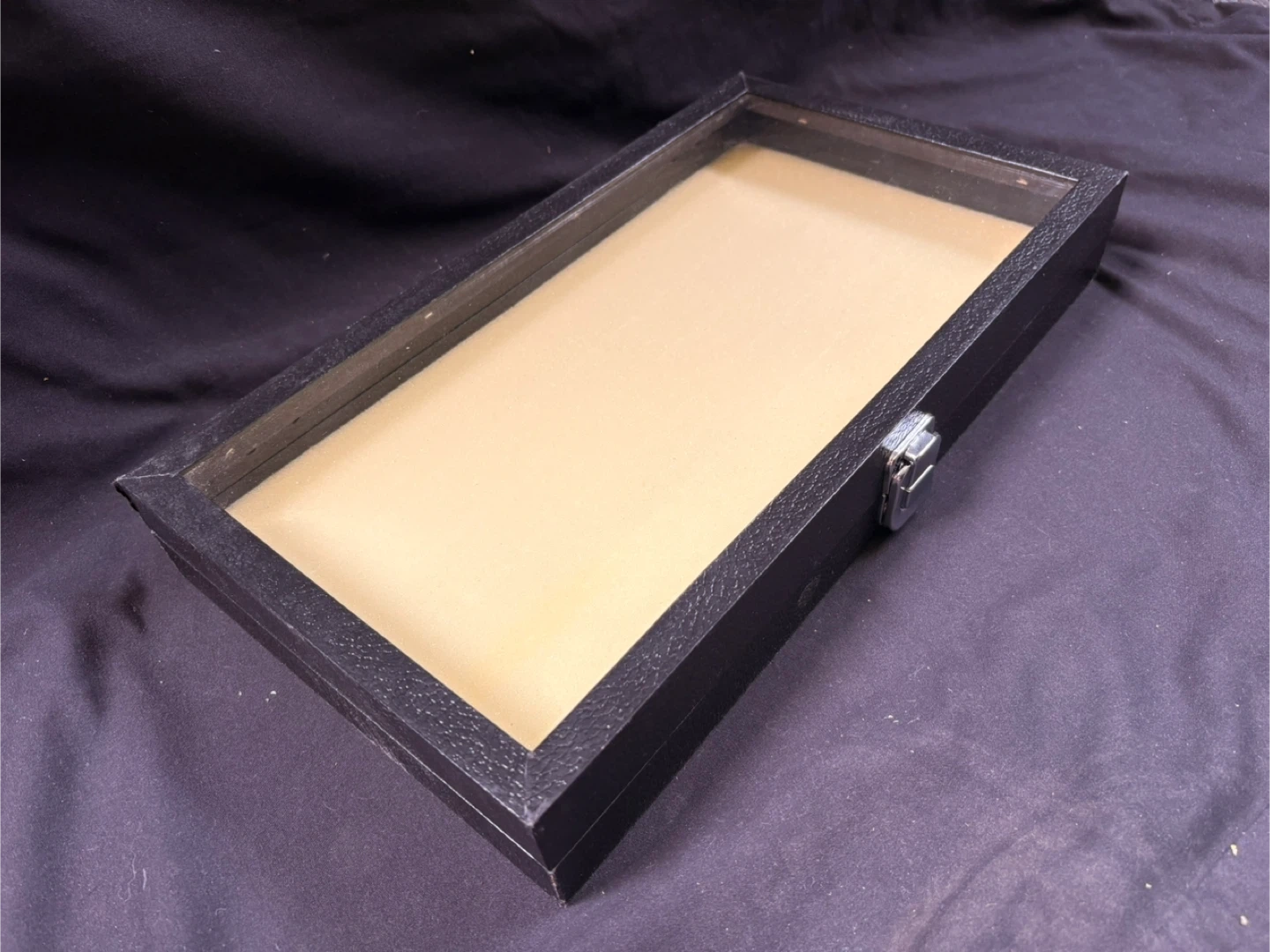 Black display case with a clear glass lid. It's perfect for showcasing collectibles or keepsakes. The interior is lined with a soft beige material and it has a secure metal clasp closure.
