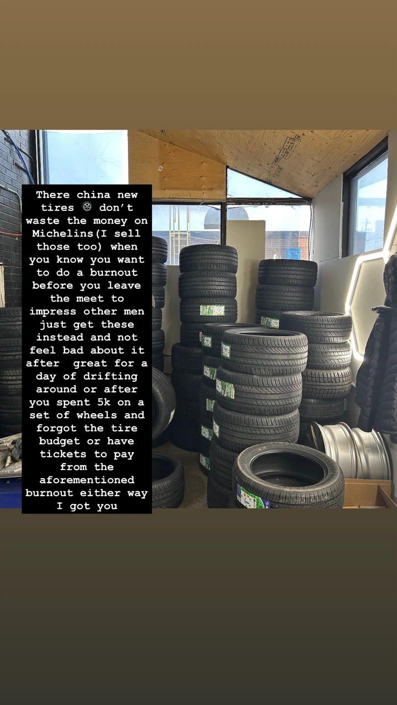 There china new tires 🛞 don’t waste the money on Michelins(I sell those too) when you know you want to do a burnout before you leave the meet to impress other men just get these instead and not feel bad about it after great for a day of drifting around or after you spent 5k on a set of wheels and forgot the tire budget or have tickets to pay from the aforementioned burnout either way I got you