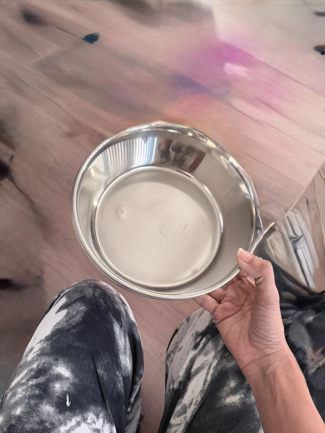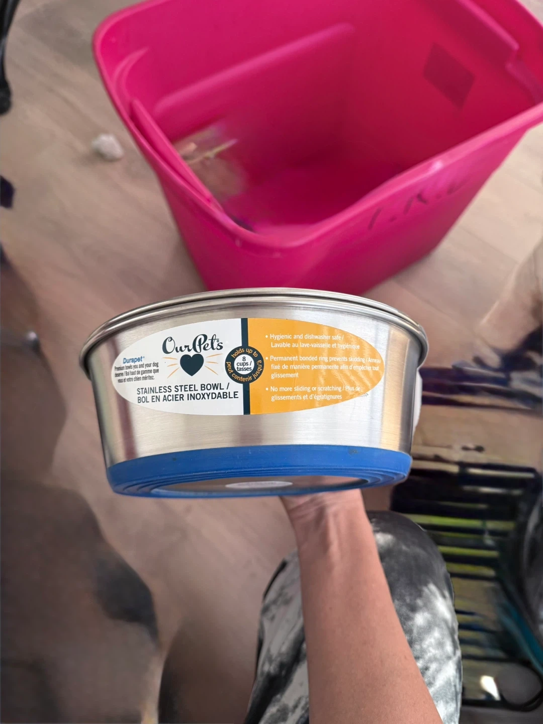 This is an OurPets premium stainless steel pet bowl. It's hygienic and dishwasher safe with a permanent bonded ring to prevent slipping. It has no more sliding or scratching!