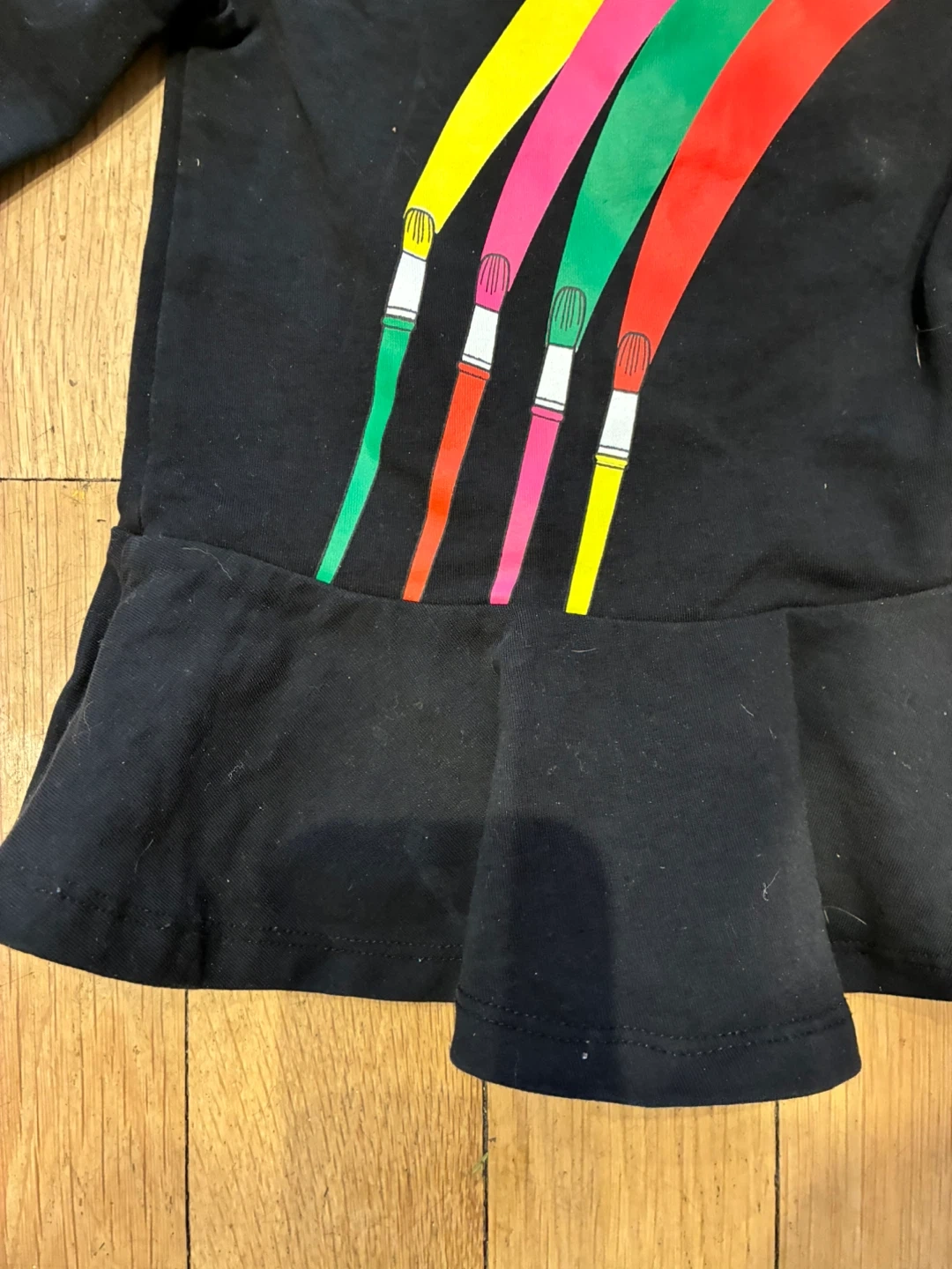 Adorable paintbrush dress for your budding little artist. It's a long-sleeved dress with a peplum hem. Size is 6-12 months.