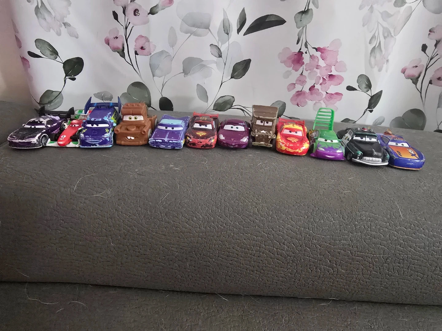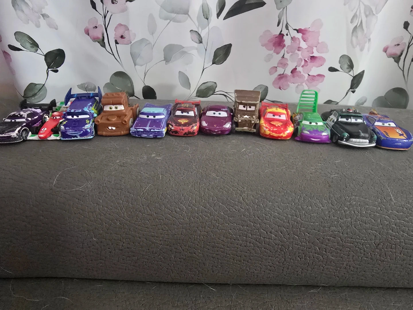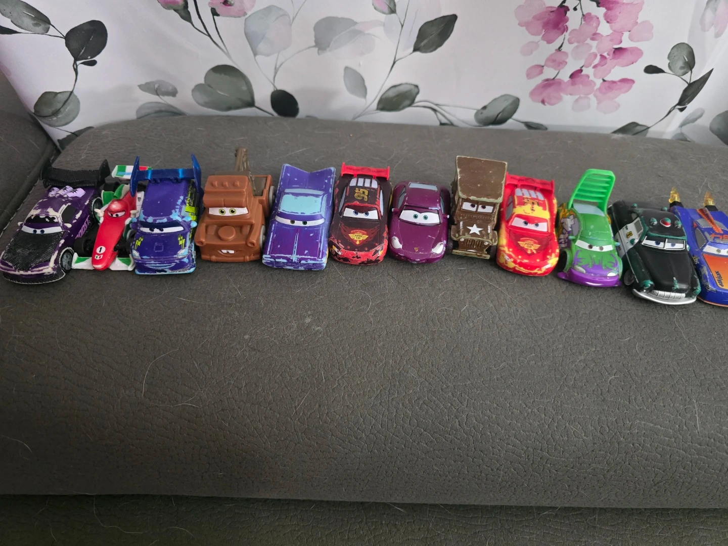 This is a lot of 11 Disney Pixar Cars toy cars. Features characters like Mater, Lightning McQueen, and others. Made of die-cast metal and plastic.