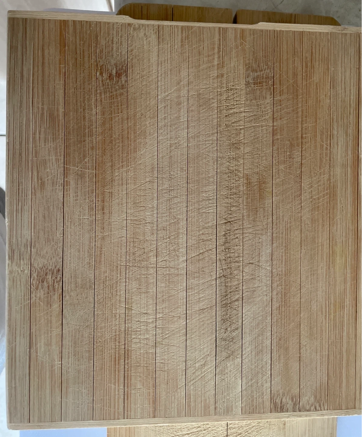 This set includes two bamboo cutting boards. They show signs of use with some knife marks.
