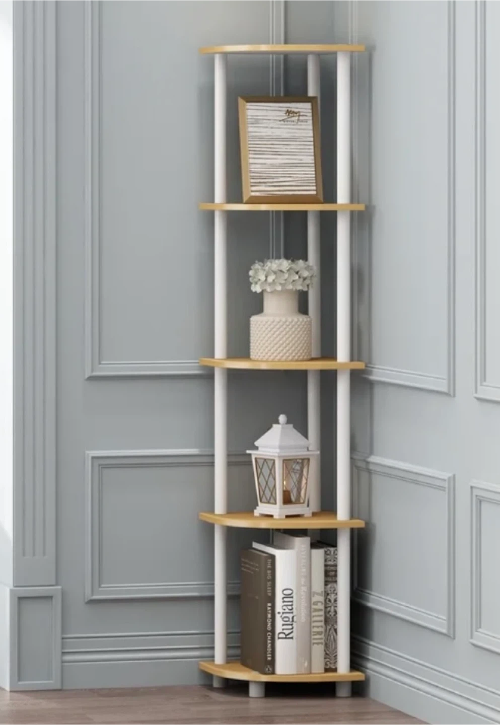 Selling this light wood color 5-tier display corner multipurpose shelf