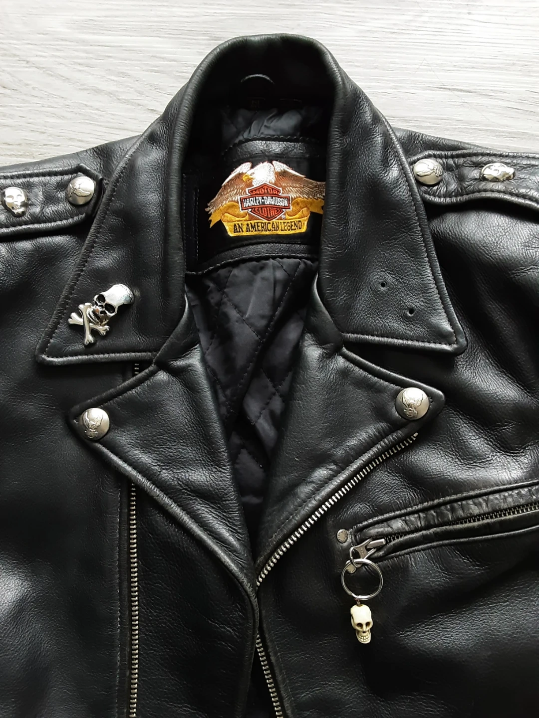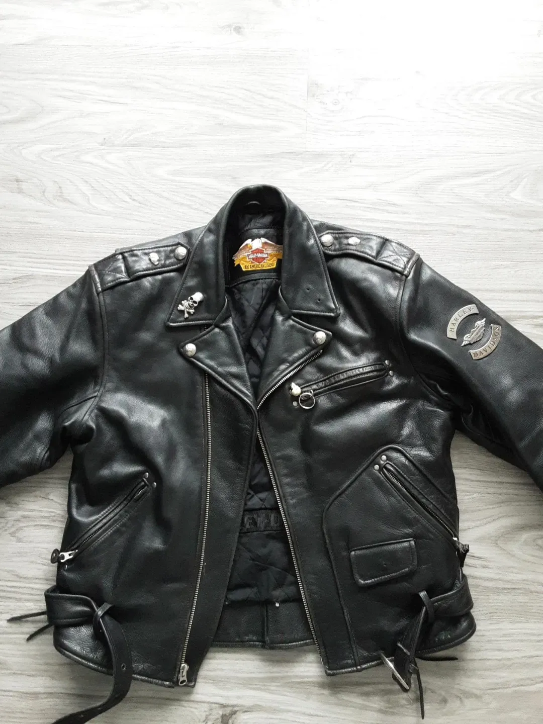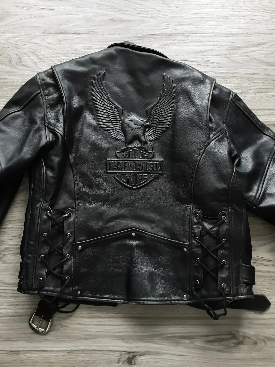 Classic black leather motorcycle jacket from Harley-Davidson. Features a quilted lining and lace-up sides. Includes iconic eagle emblem on the back. A true American legend!