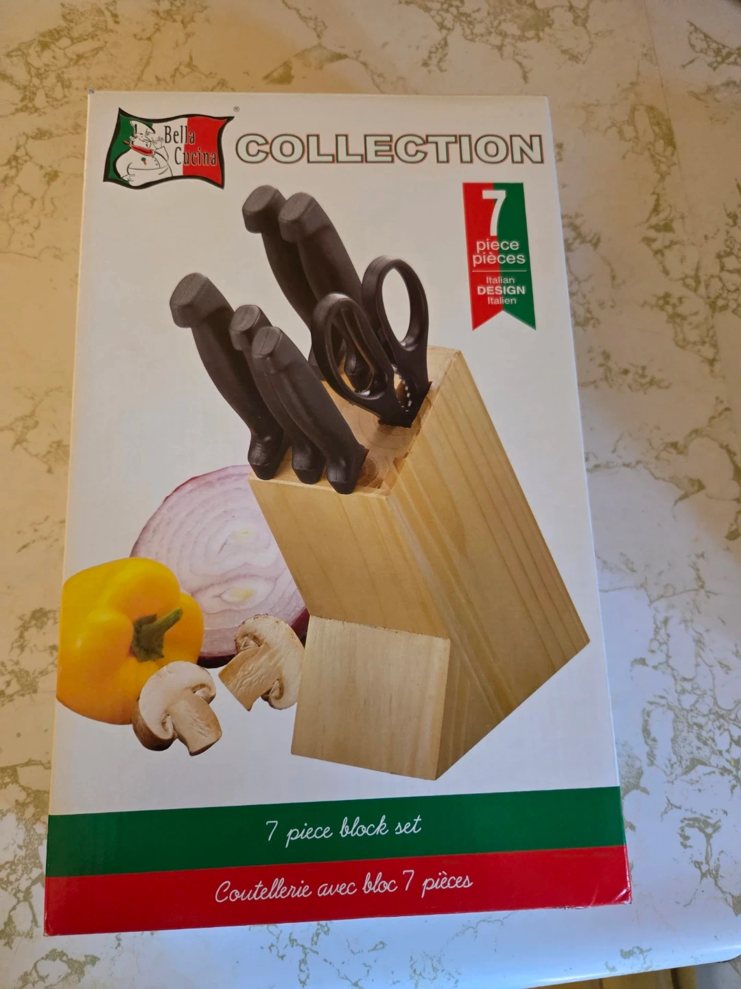 This is a Bella Cucina 7-piece knife block set. It features an Italian design. The set includes knives and a block. Useful for everyday kitchen tasks!