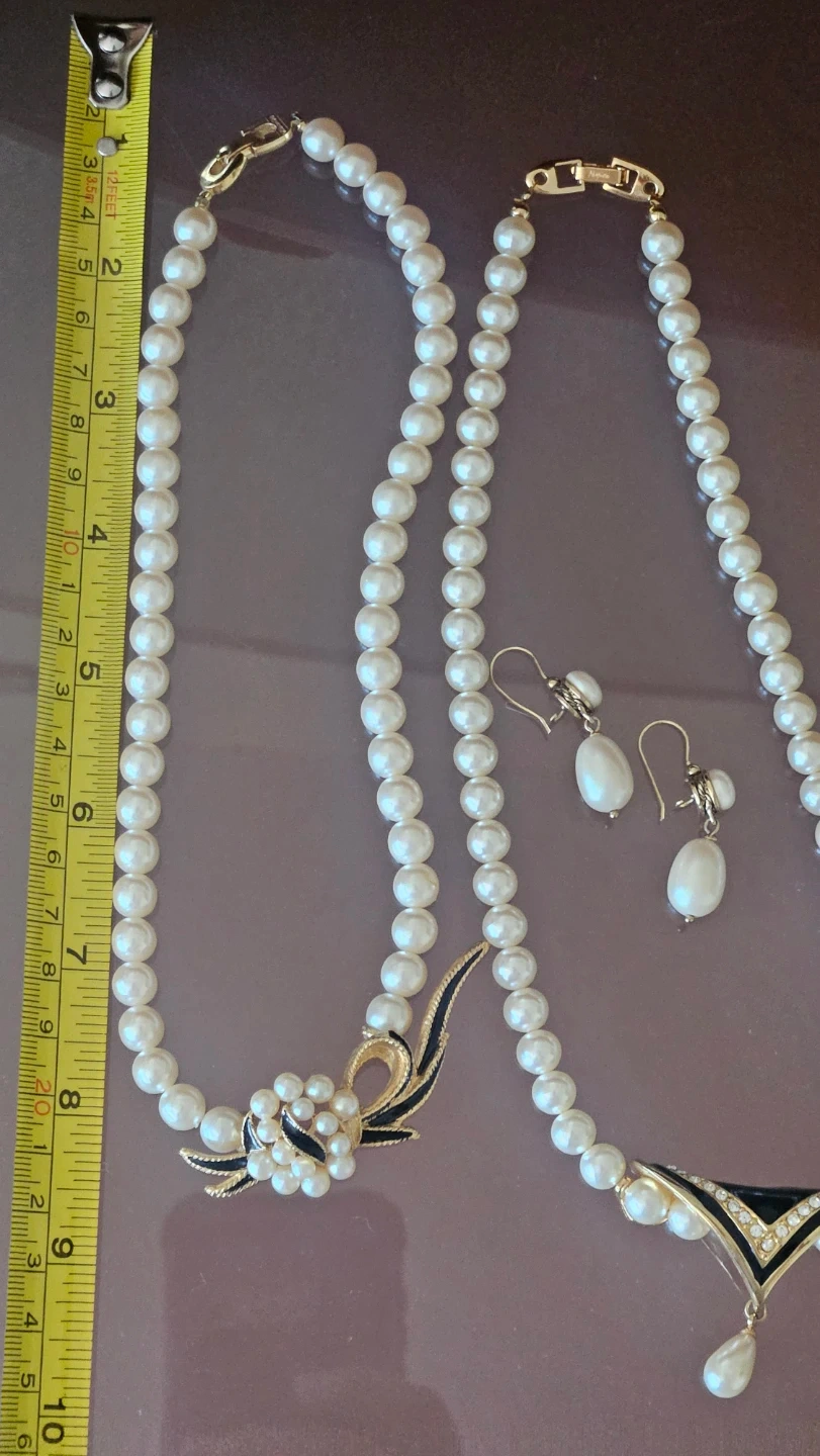 This Napier set includes a faux pearl necklace with a decorative clasp and matching dangle earrings. The necklace features a floral-inspired clasp with black enamel accents. The earrings also have pearl drops and black detailing.