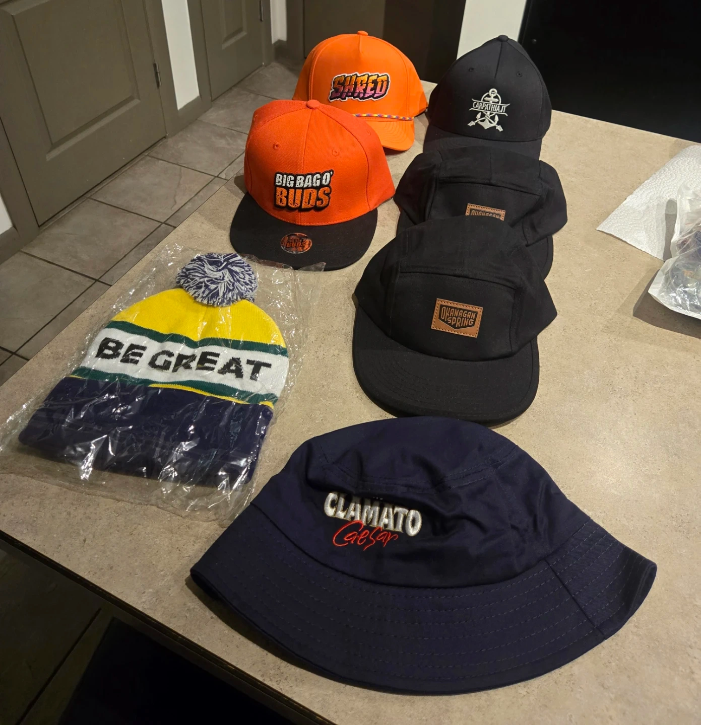 This lot includes a variety of hats and a beanie. Items feature different brands and graphics.