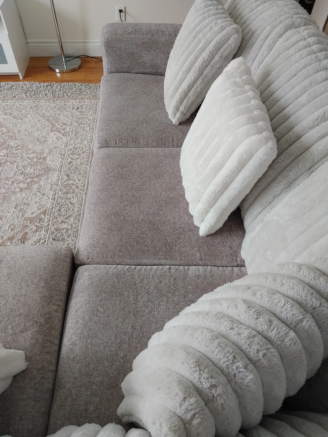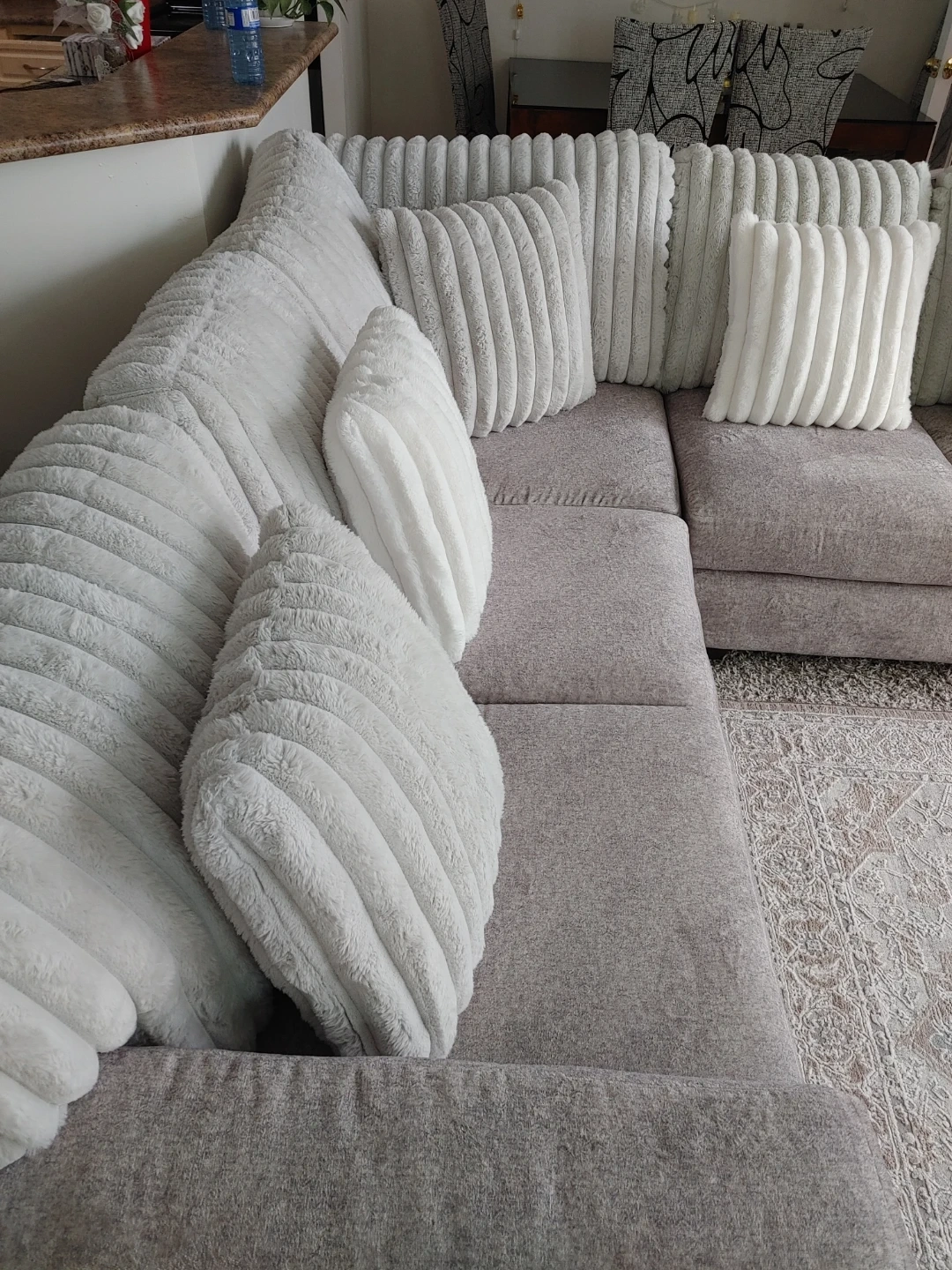 Cozy grey sectional sofa featuring plush, textured throw pillows in varying sizes. It's made with a durable fabric and offers ample seating space for your living room. This sofa is perfect for relaxing evenings at home!