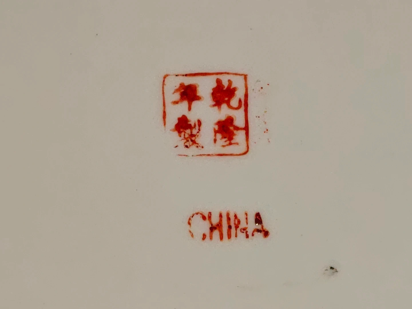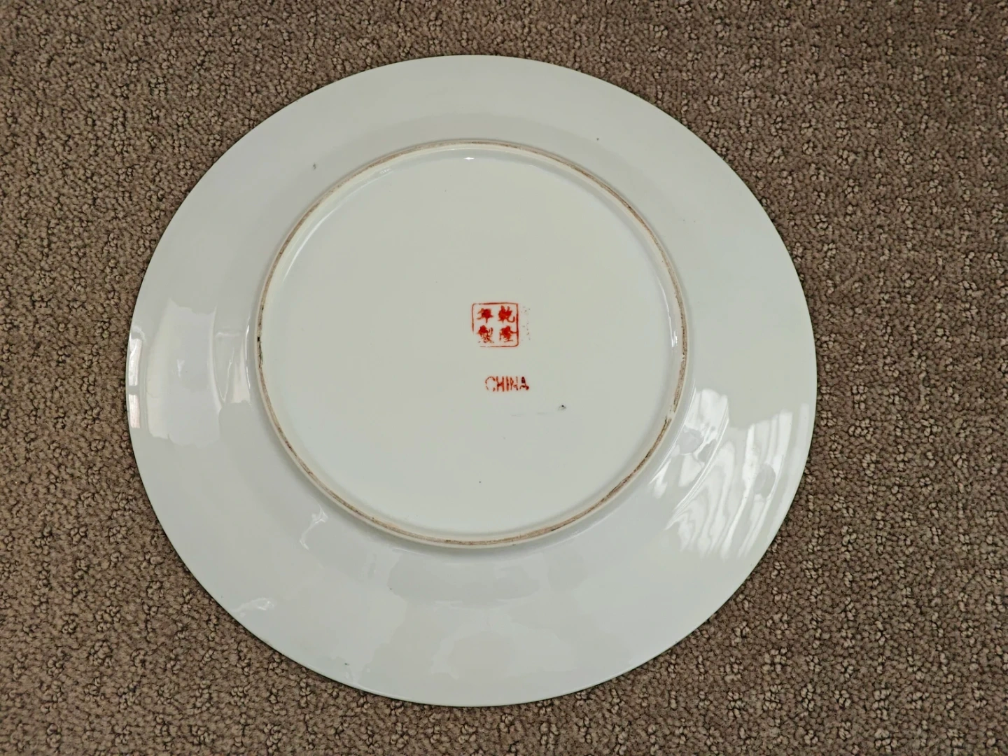 The reverse of the plate features a red "Qianlong Zian Zhi" stamp. This is a common "apocryphal" reign mark on Chinese export porcelain, signifying a piece from the mid-20th century rather than the 18th-century reign of the Qianlong Emperor. This plate is a genuine vintage collectible from this era (c. 1930s-1960s).