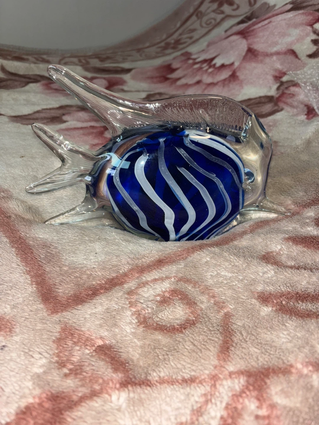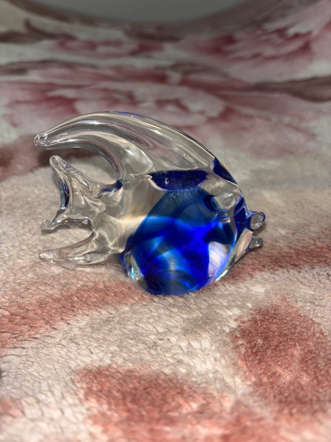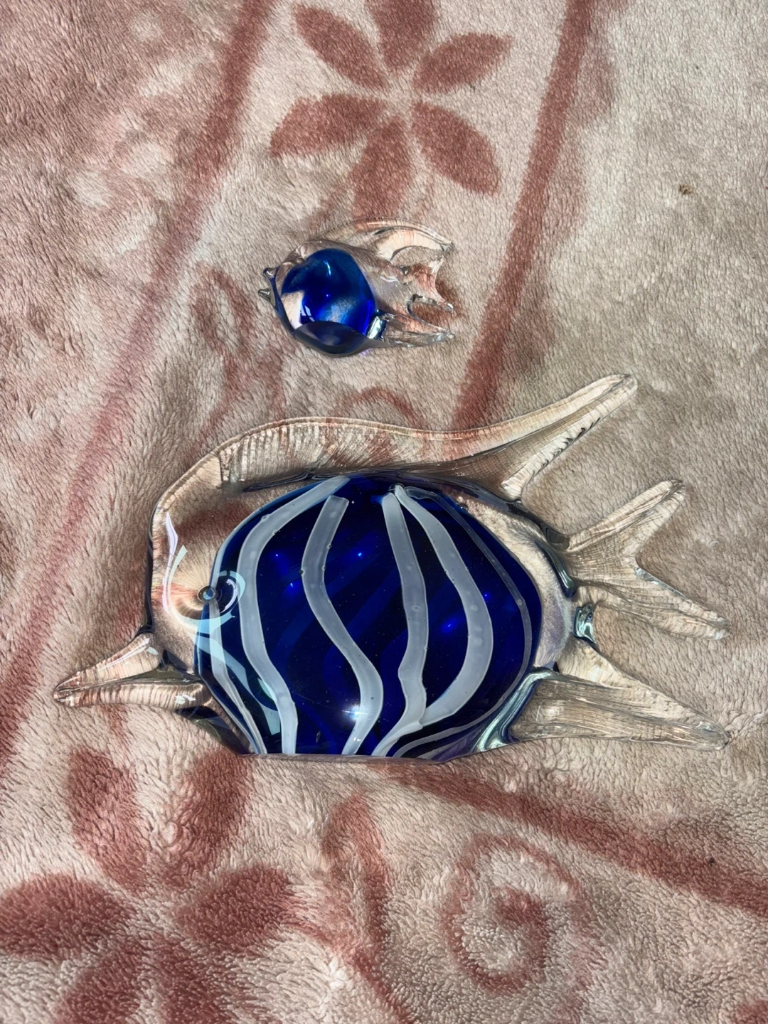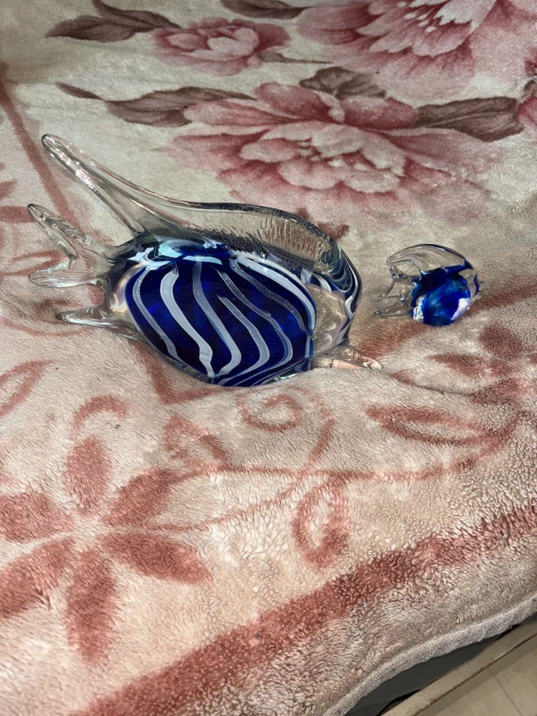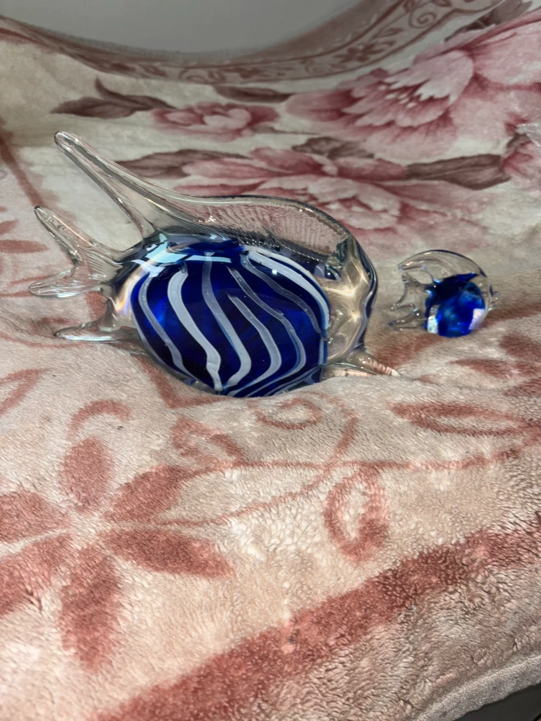 Beautiful art glass angelfish figurines, one larger with blue and white stripes and a smaller blue one. They're made of clear glass with vibrant blue accents. Big one weighing 6 lbs and the small one weighing about 2 lbs.