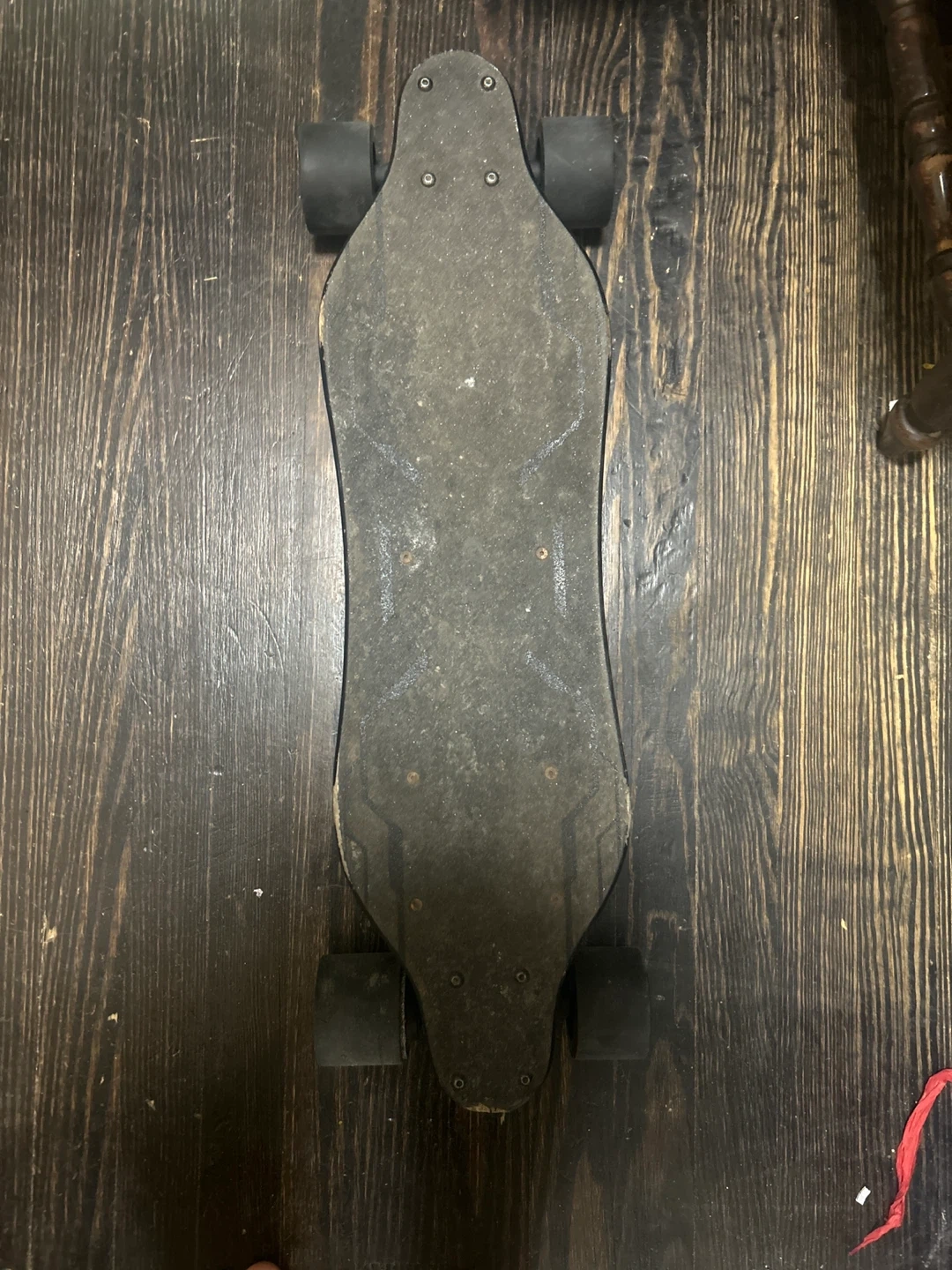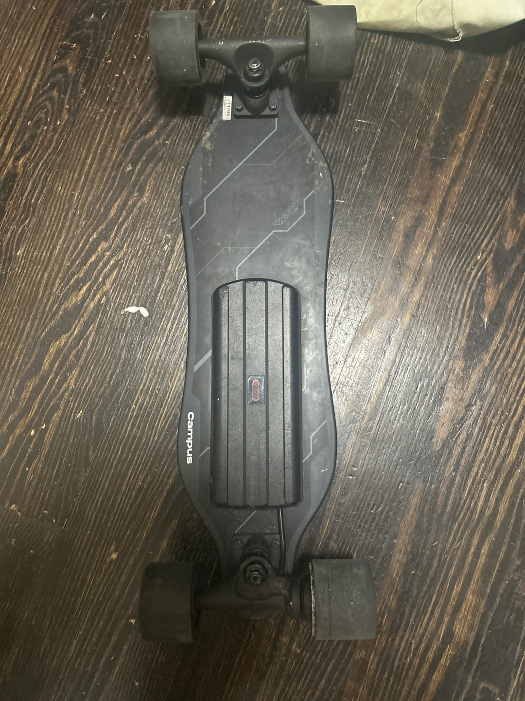 This is a Campus electric skateboard. It's black and has a longboard shape. The bottom shows the battery housing and trucks. Already used still works (no charger or remote) works perfectly fine