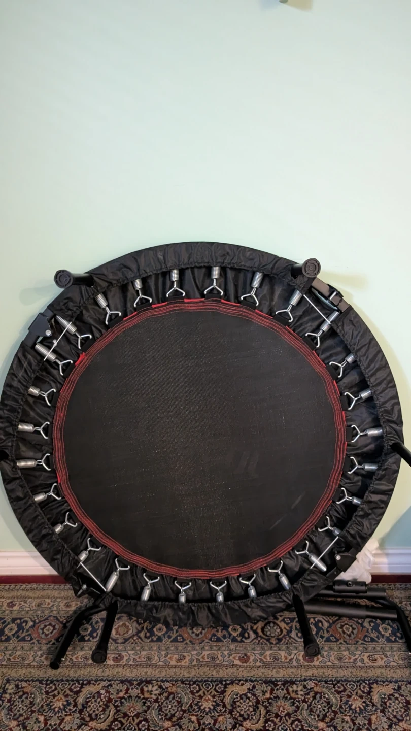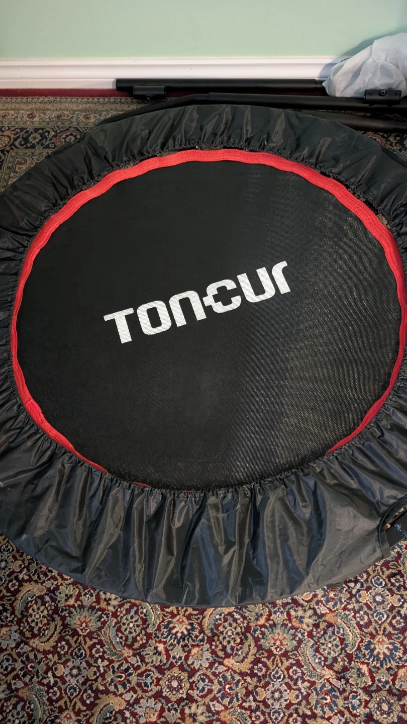 This Toncur mini trampoline is great for home workouts. It features a durable jumping mat and sturdy springs for a good bounce. Its compact size makes it easy to store. 39". Never used, instructions included. Bar included for stability.