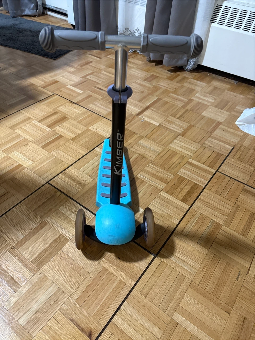 This is a KIMBER 3-wheel scooter, perfect for younger riders. It features a bright blue deck with purple grip details and comfortable grey handlebars. The three-wheel design offers stability for beginners. It's a fun way for kids to get around!