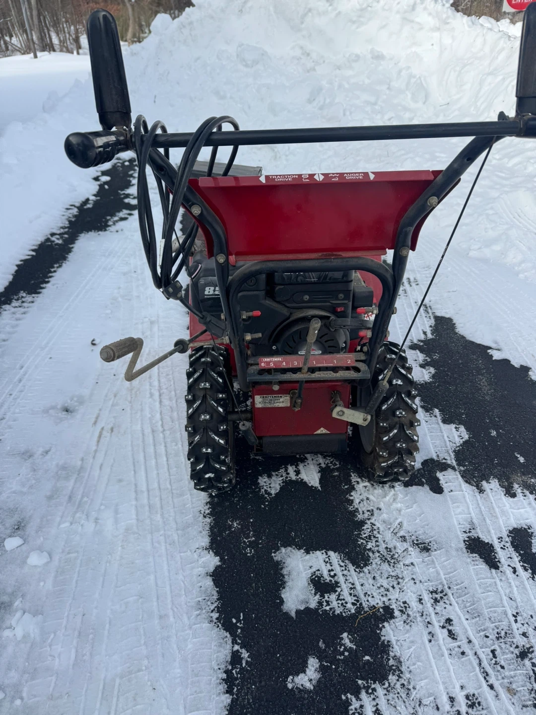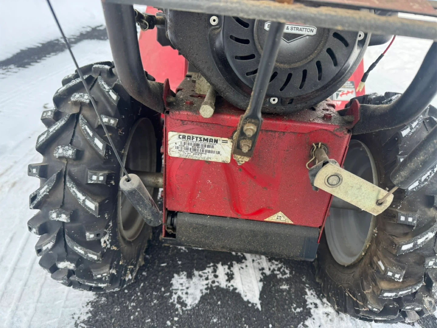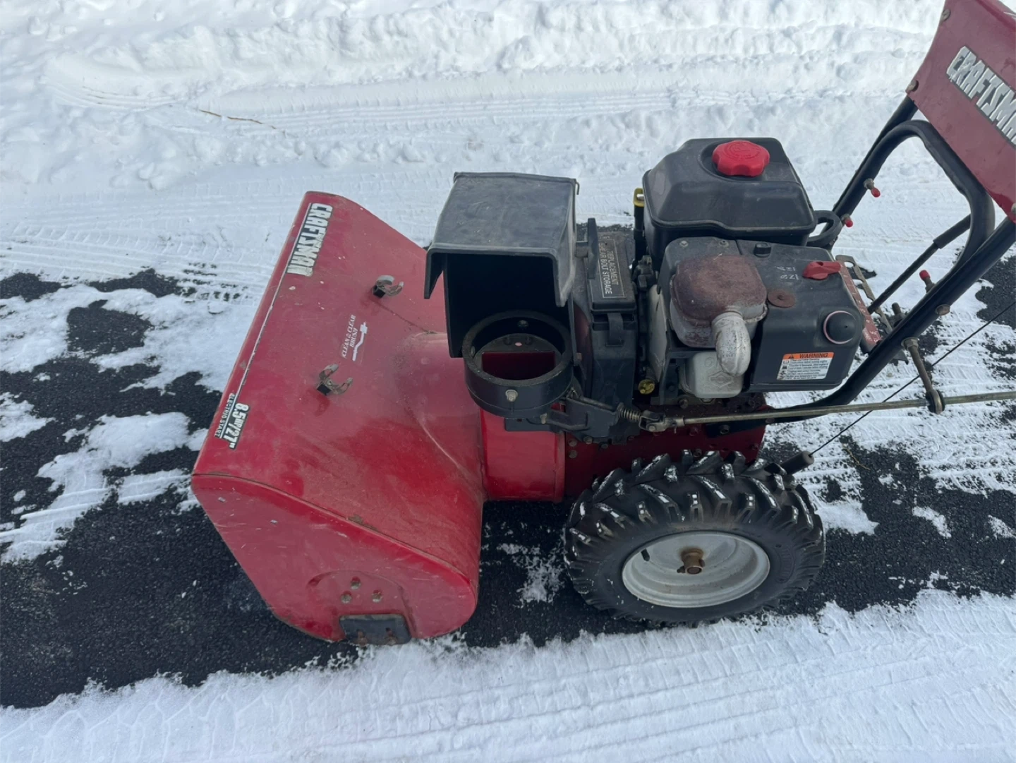 This is a red Craftsman snow blower with a 8.5 horsepower engine and a 27-inch clearing width. It features large, treaded tires for traction. The machine has a pull start and a chute for directing snow.