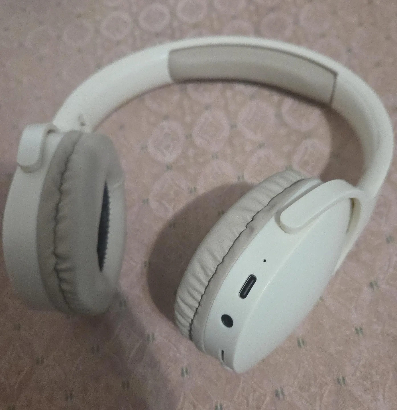 These white over-ear headphones have a USB-C charging port and a 3.5mm audio jack. They're comfortable for extended listening sessions. A charging cable is included.