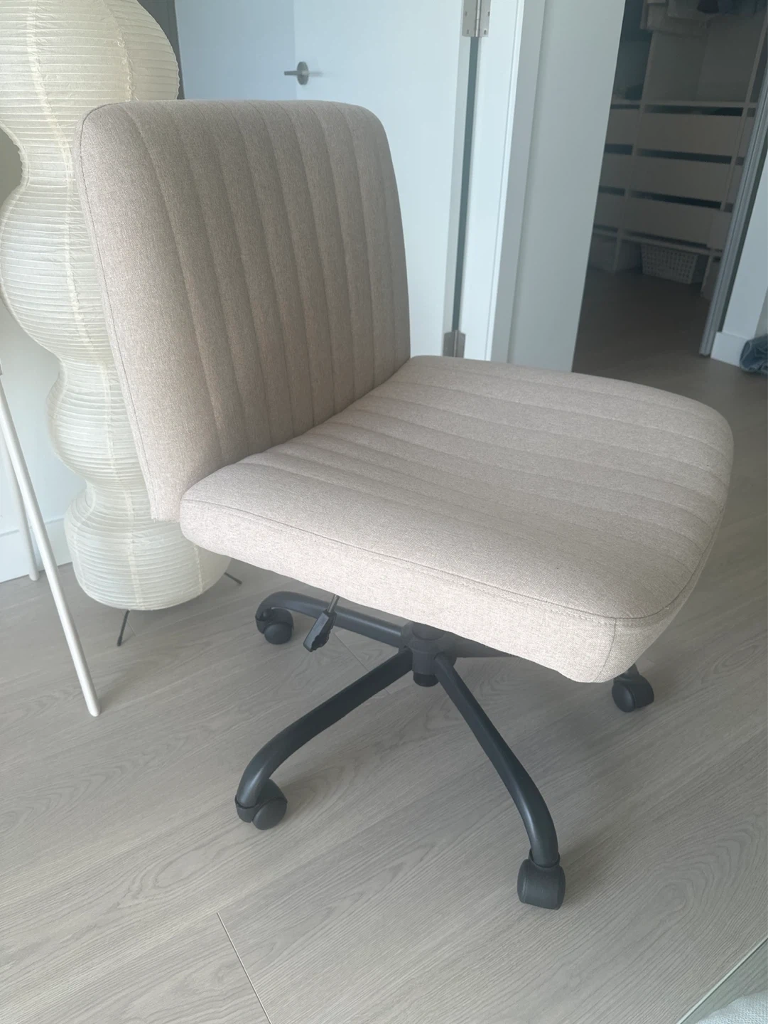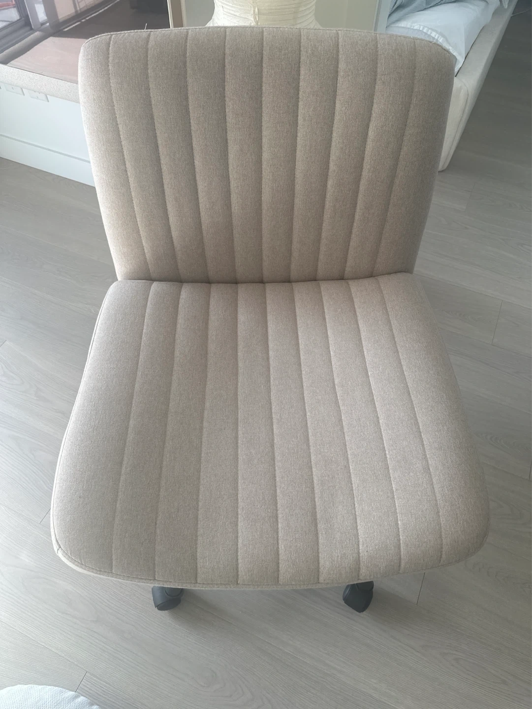 Tan upholstered office chair with a ribbed design. It has a swivel base with wheels and adjustable height. This chair offers comfortable seating for your home office space.