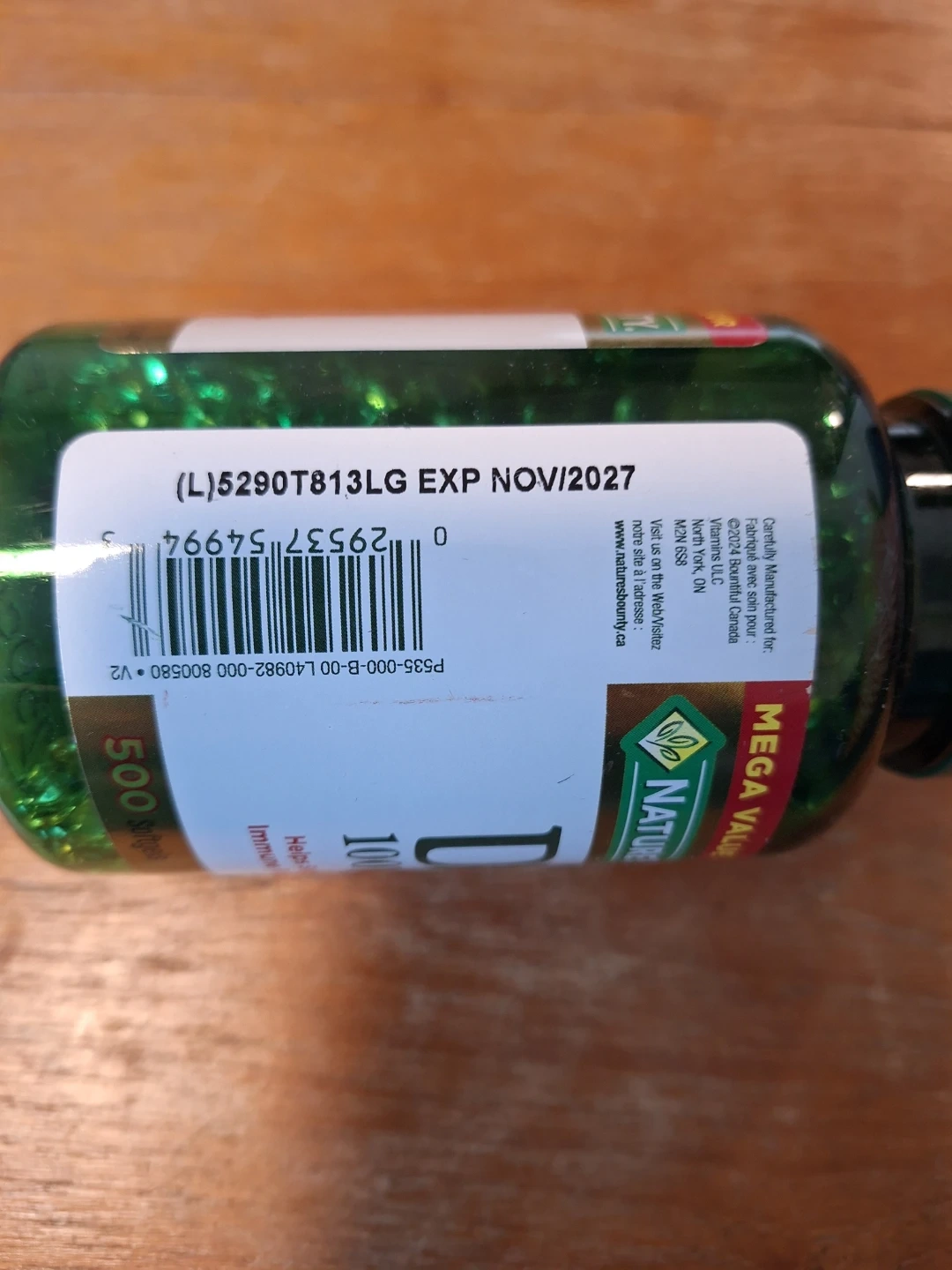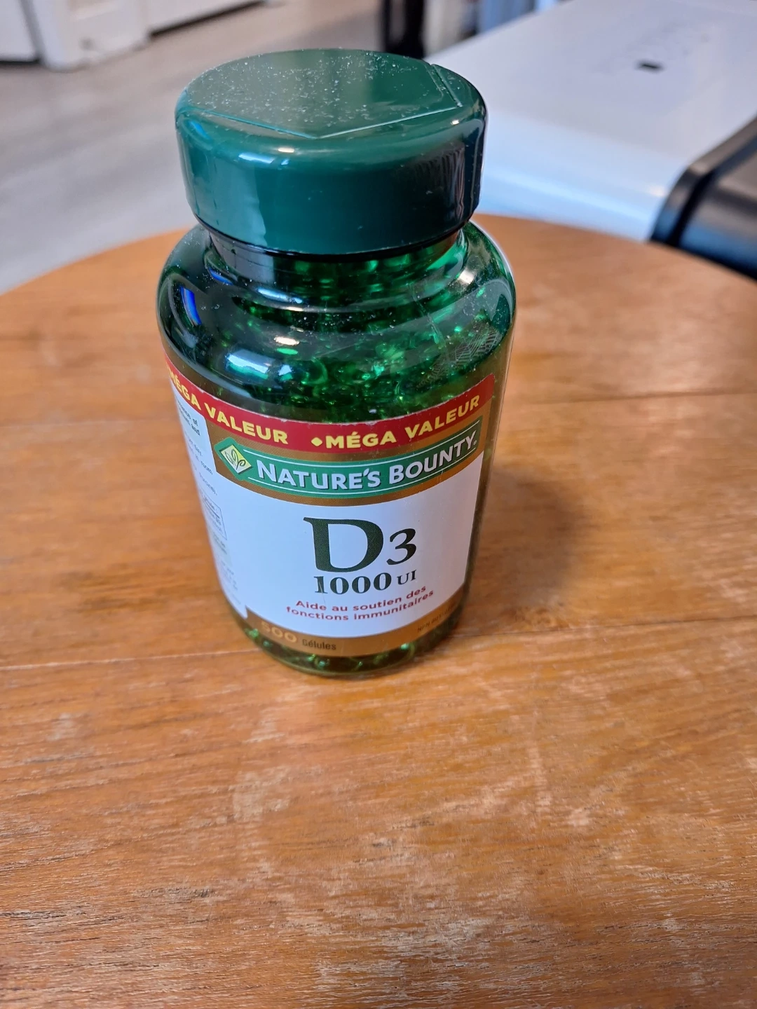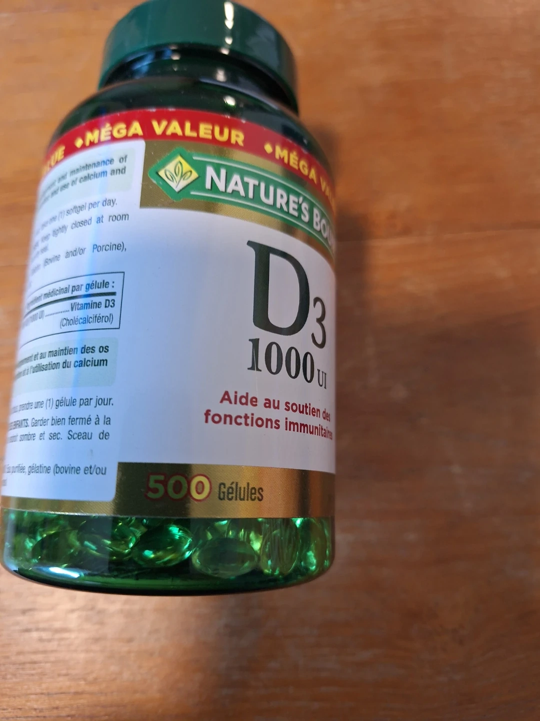 Nature's Bounty Vitamin D3 softgels provide 1000 IU each. This bottle contains 500 softgels, helpful for immune function. Expiry date is November 2027.