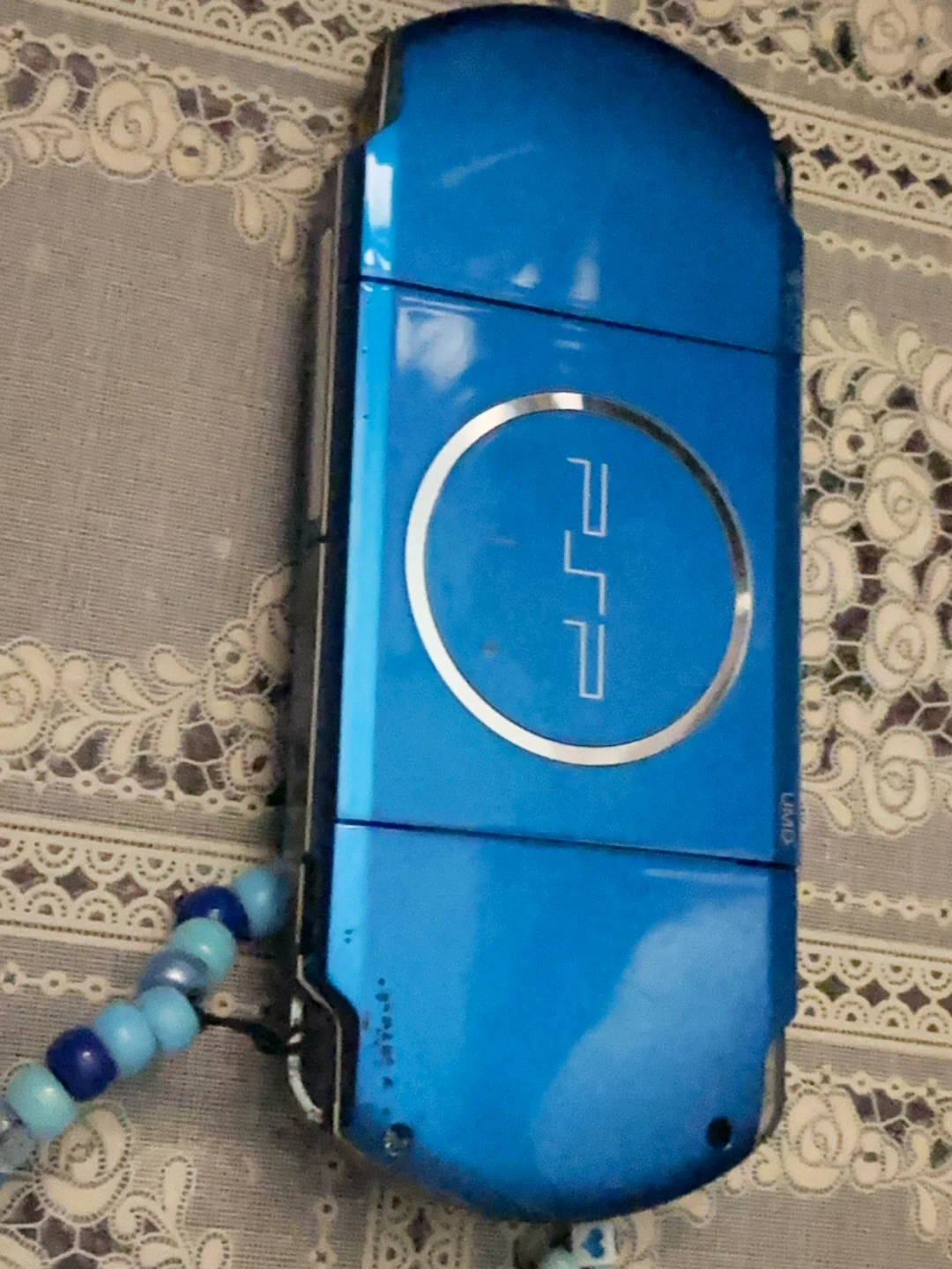 Modded Blue Sony PSP 3001 handheld gaming console. Features a bright LCD screen and intuitive controls for gaming on the go. Includes charging cable only