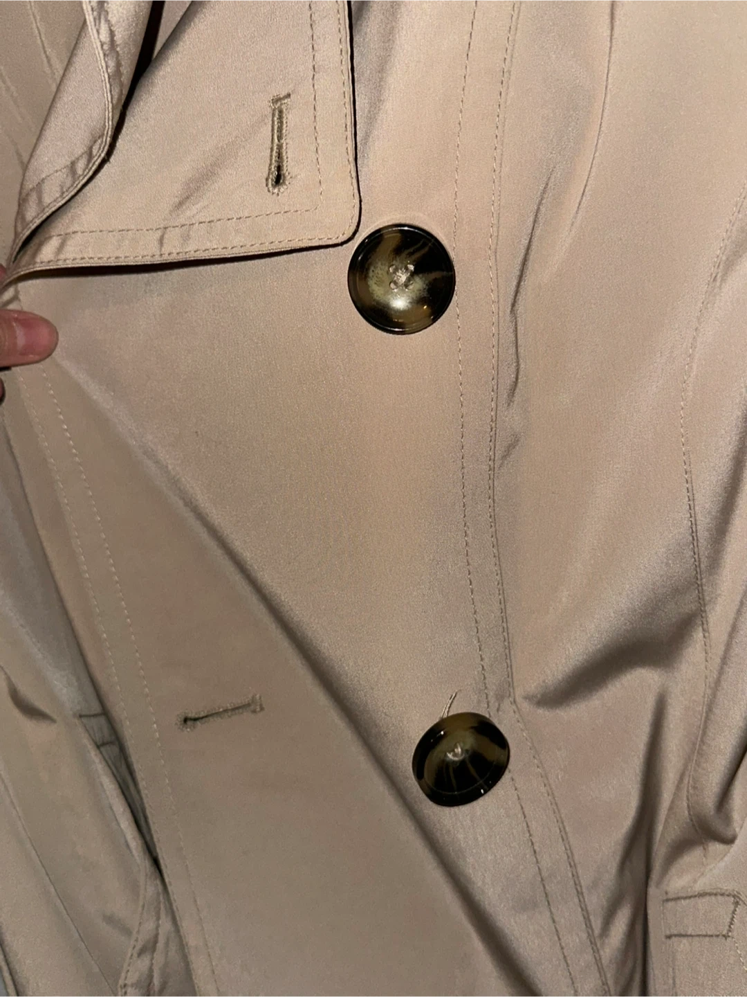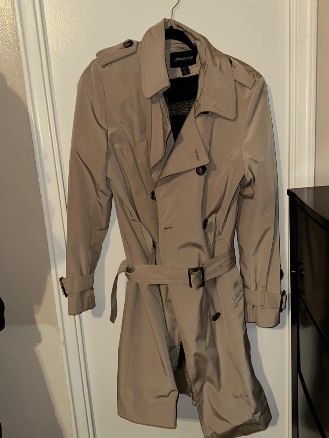 This classic London Fog trench coat is a stylish outerwear option. It features a plaid lining and a double-breasted closure. Size is medium/medium.