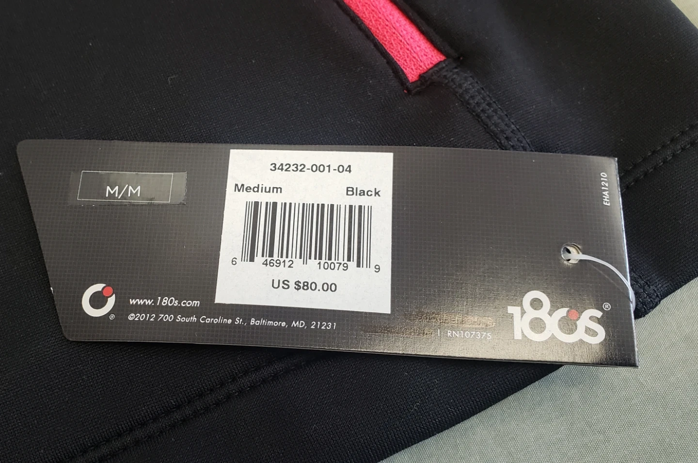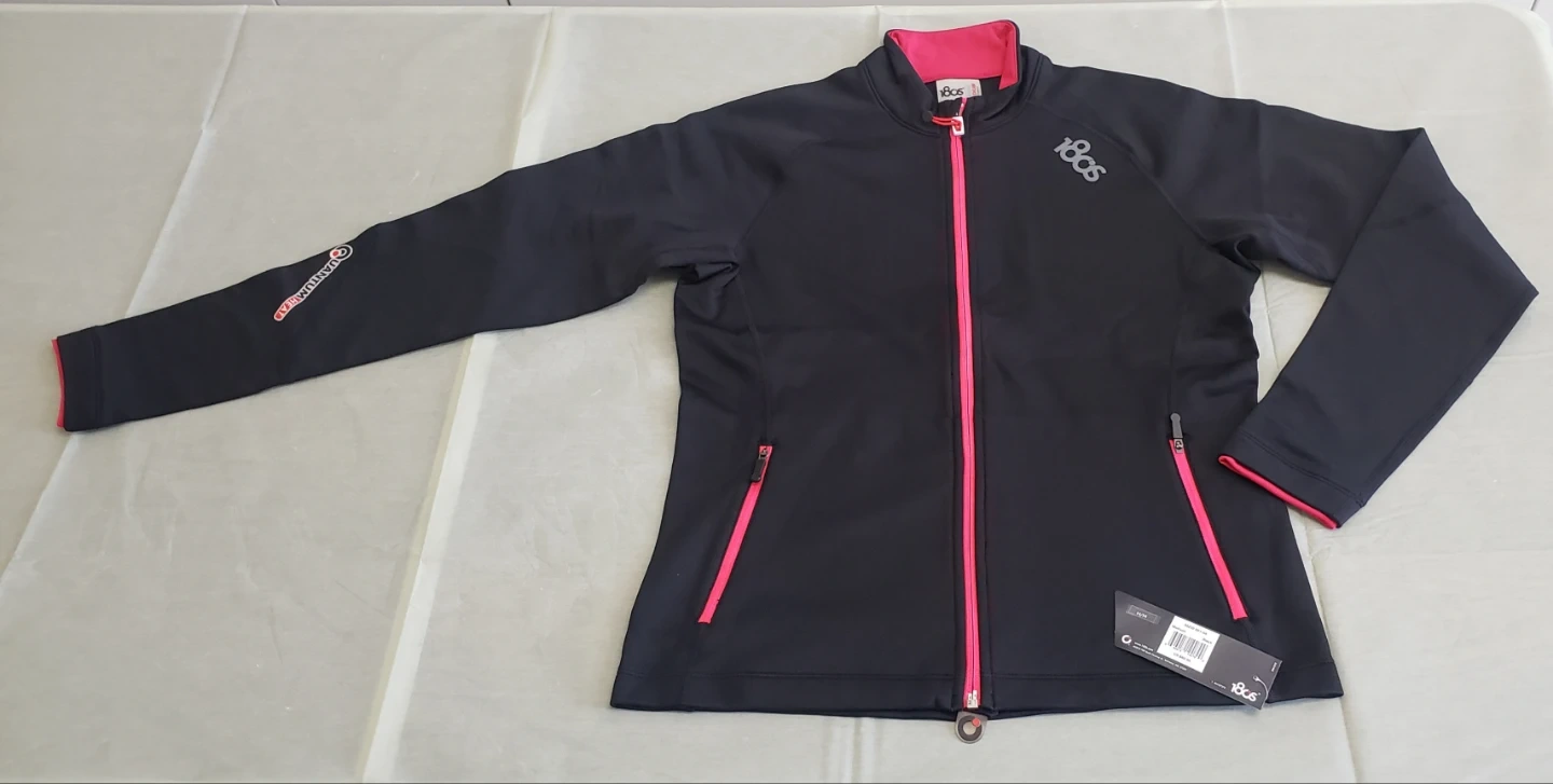 This is a black 180s jacket in size Ladies medium. It features a full zip front and pink accents on the collar, cuffs, and zipper pulls. Two zippered hand pockets are also present. Brand new, cash only pickup in Queens NY