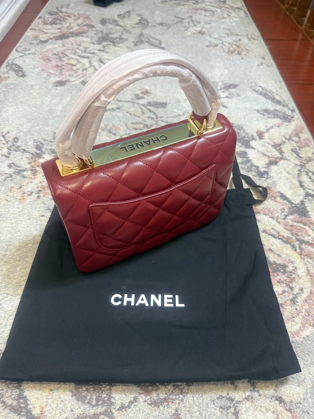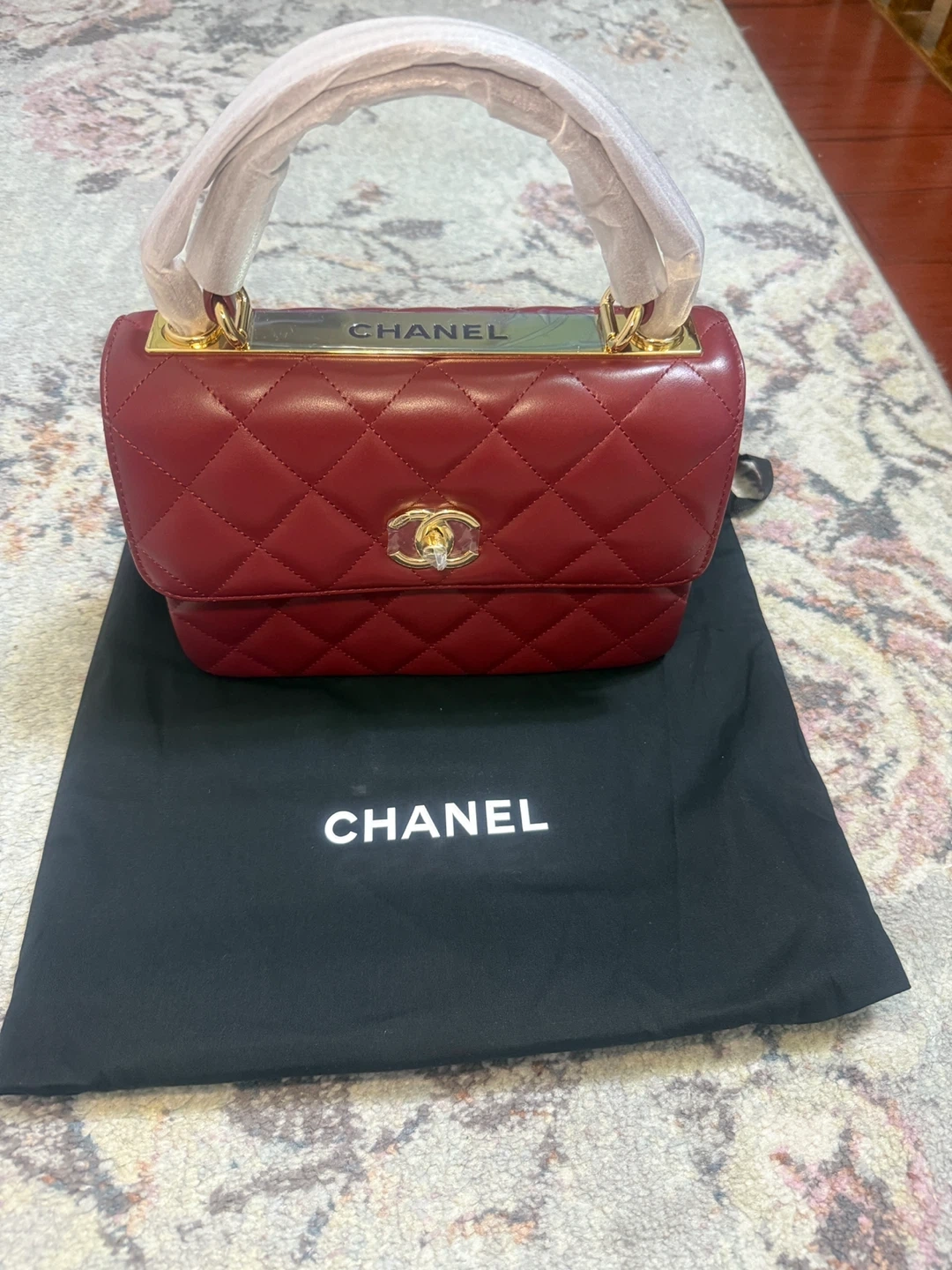 This is a stylish Chanel top handle bag in a deep red colour. It's made from quilted leather with gold-tone hardware. The bag includes its original Chanel dust bag. It's a sophisticated accessory for any occasion!