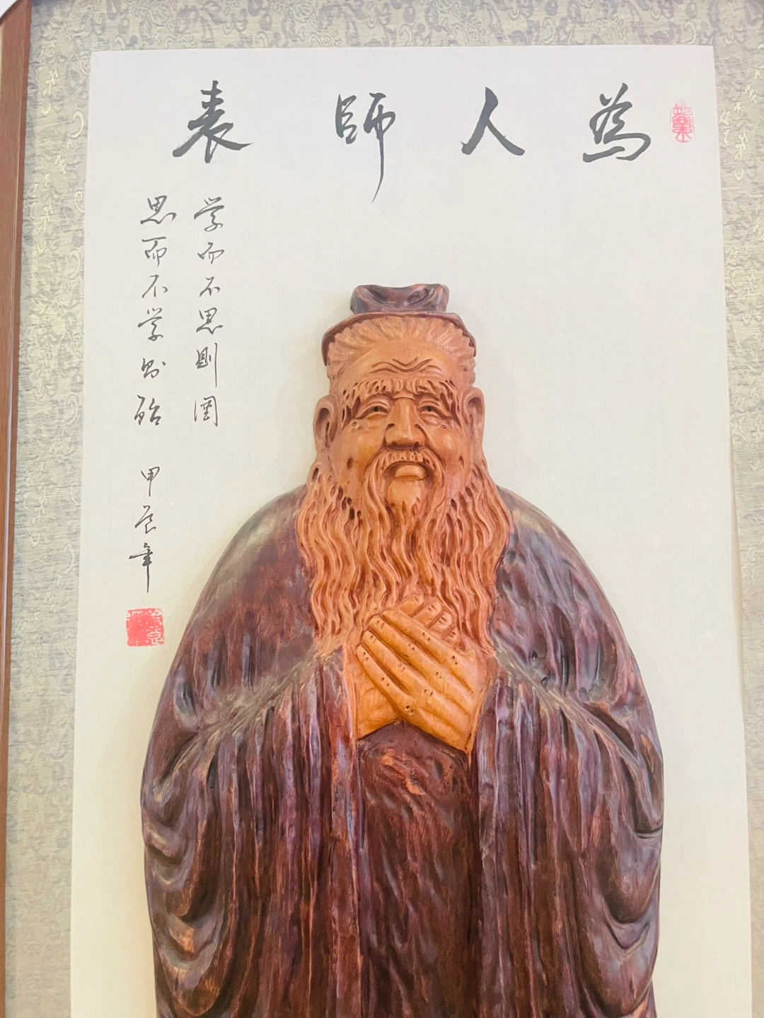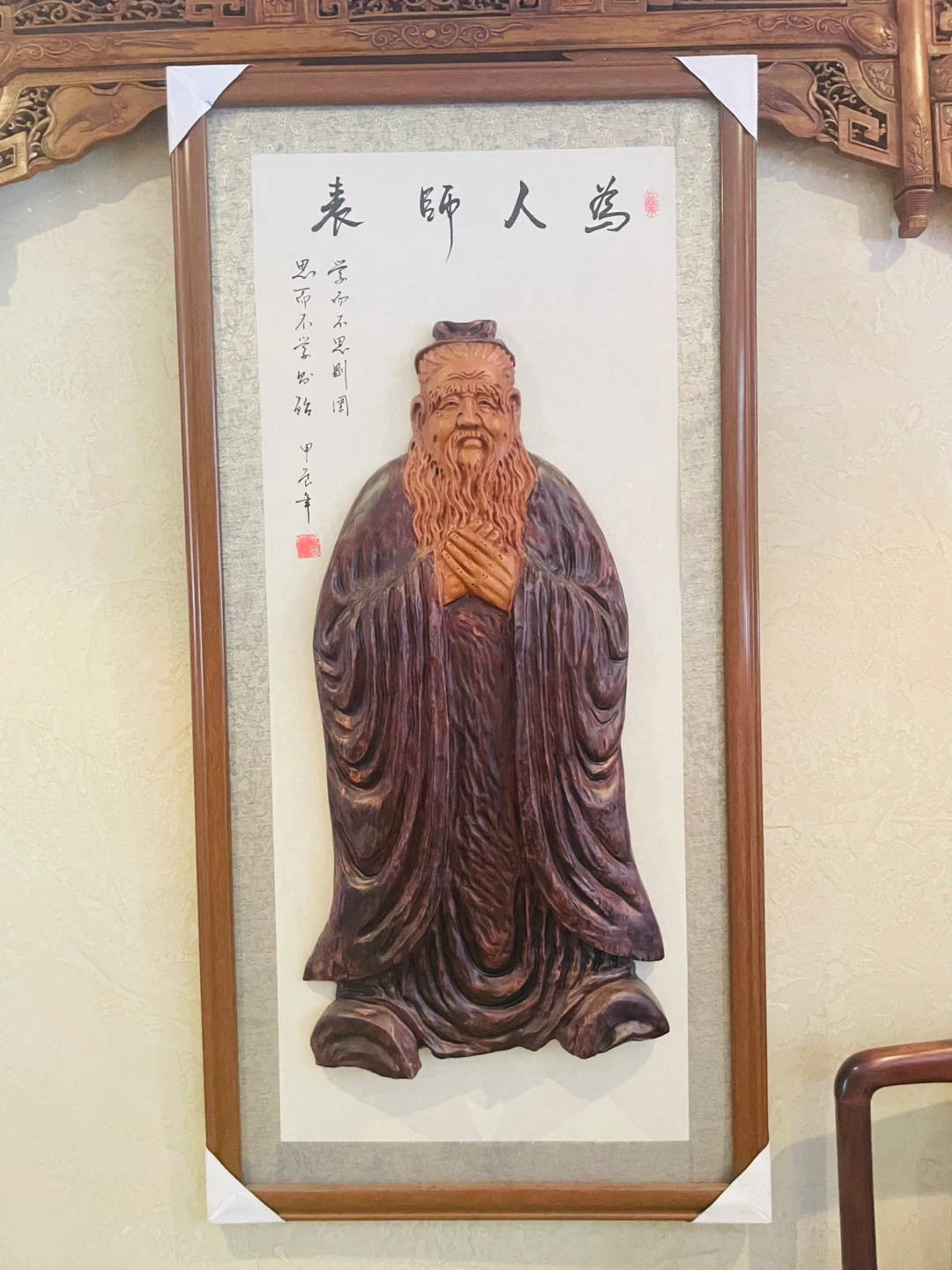 This is a framed wooden carving depicting an ancient Chinese scholar. It features intricate details on the robe and beard. The piece is mounted on a white background with traditional Chinese calligraphy and a red seal. It's a unique decorative item.