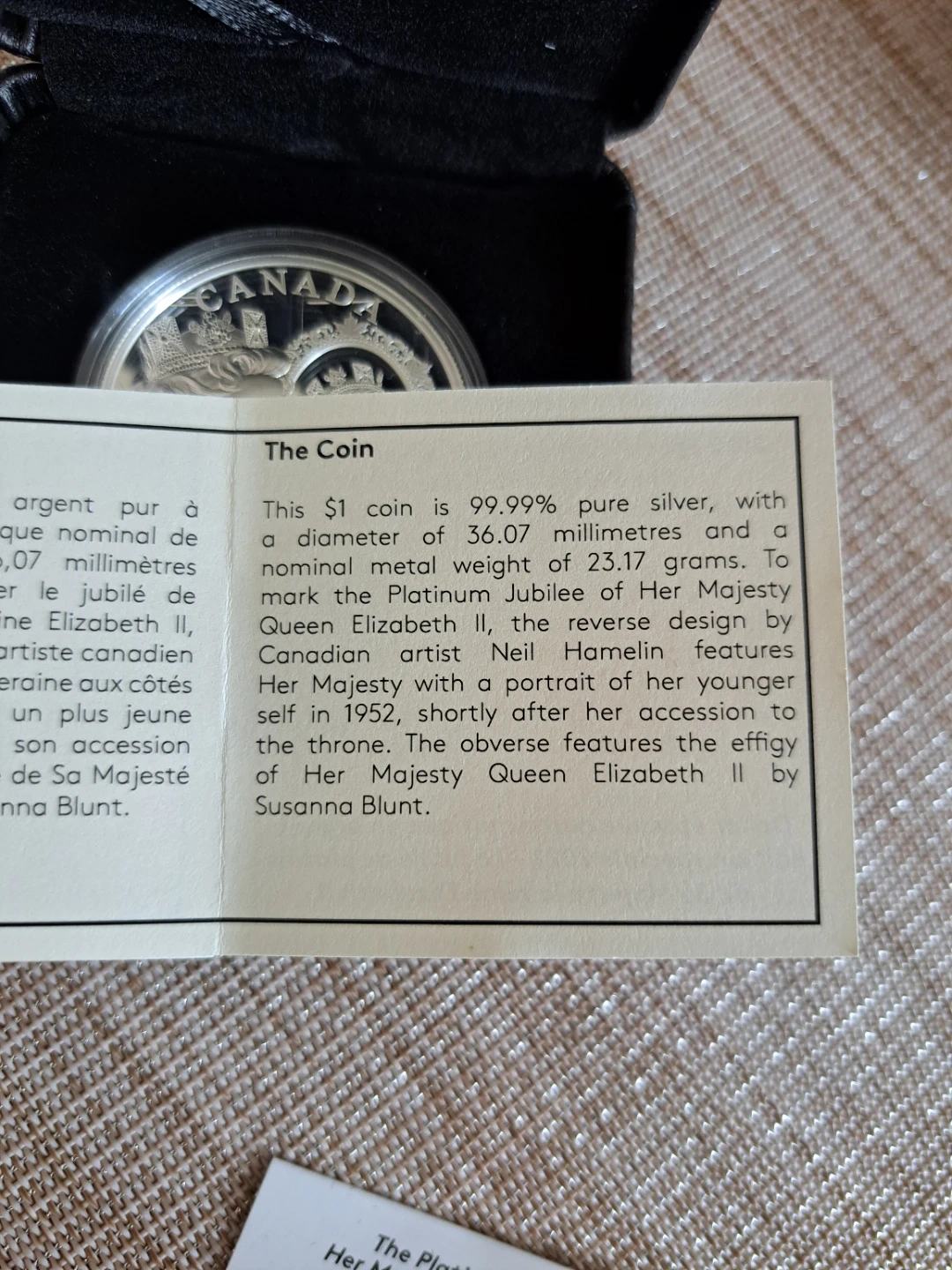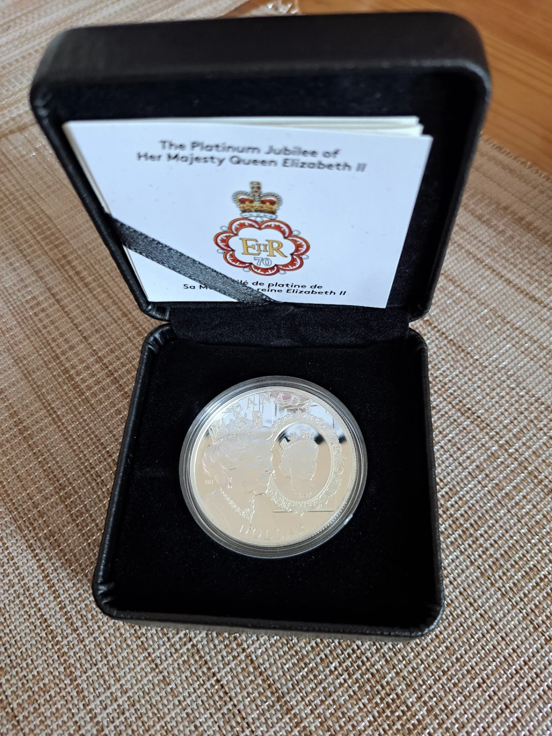 This $1 coin is 99.99% pure silver with a nominal metal weight of 23.17 grams. It features Her Majesty Queen Elizabeth II and marks the Platinum Jubilee. Includes original case and certificate.