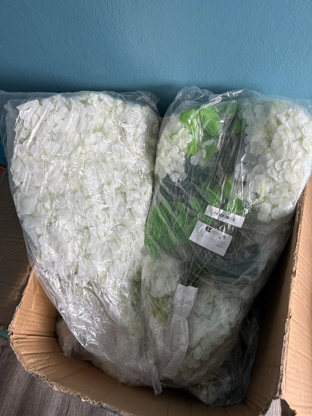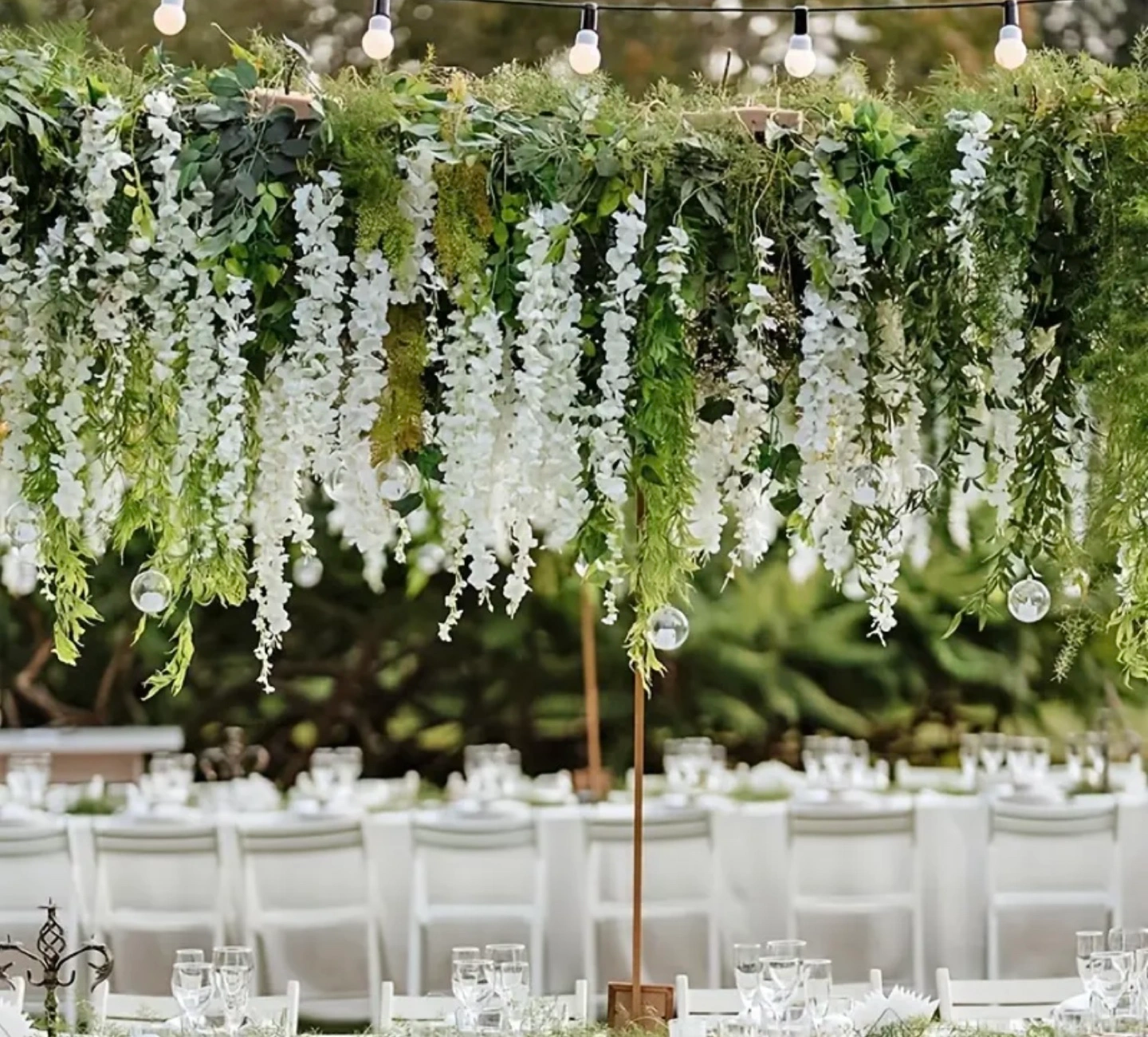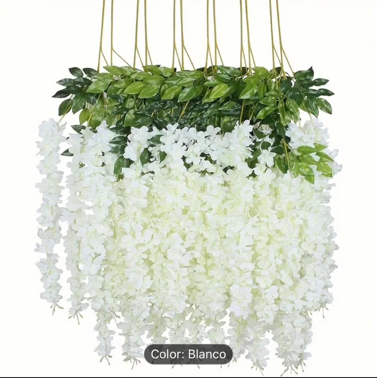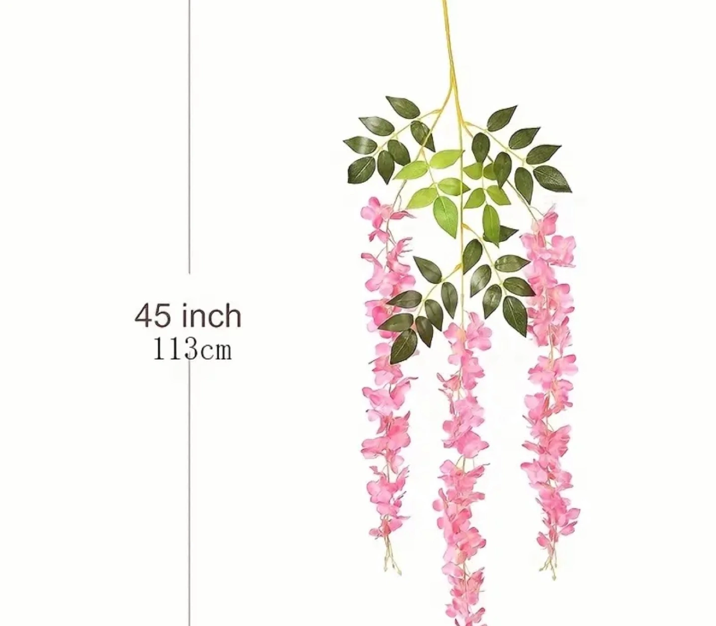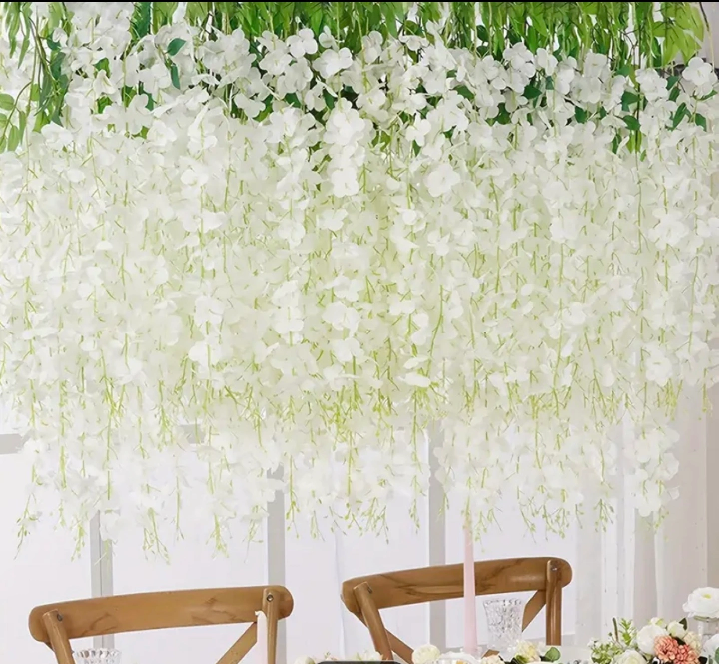 Beautiful artificial wisteria vines, perfect for weddings or other events. White flowers and green leaves. Multiple vines included. Approximately 45 inches long. Adds a touch of elegance to any space.