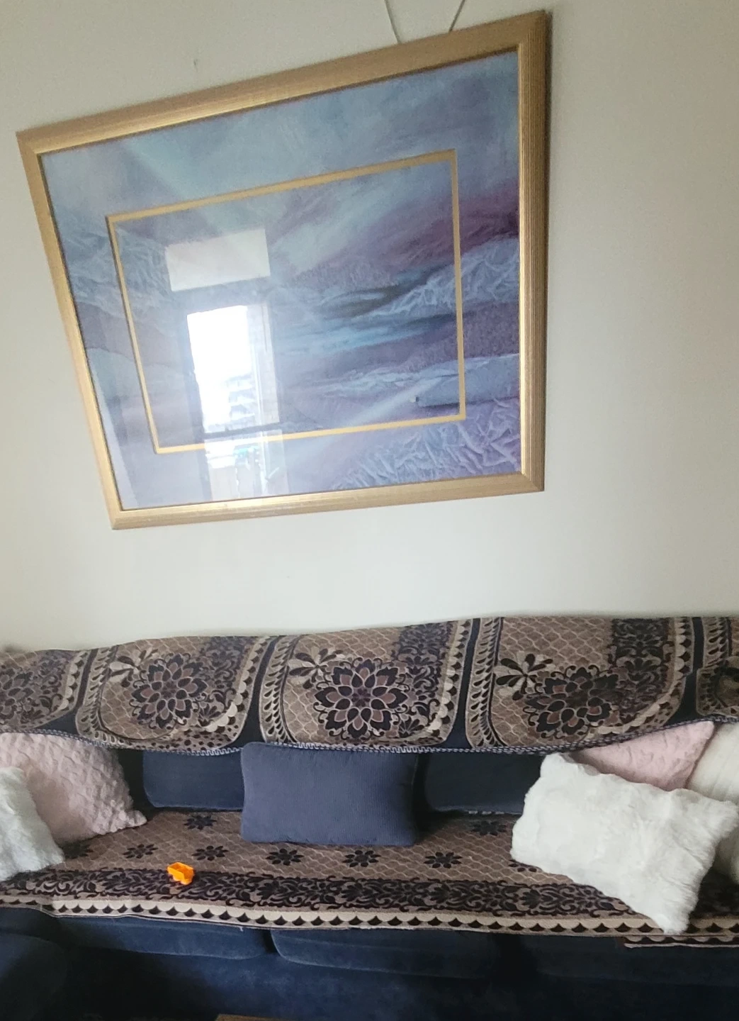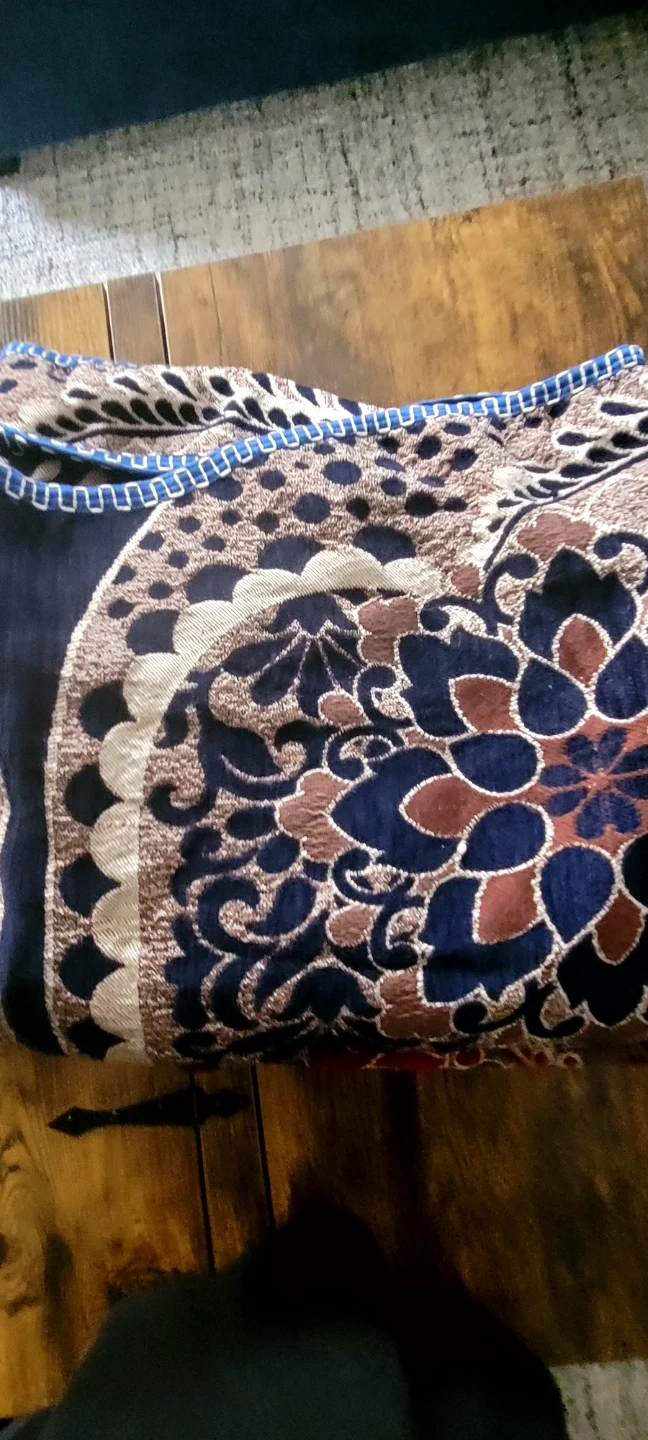 A decorative blanket or cover for your sofa. It features a rich, intricate floral pattern in navy blue, brown, and beige tones. Adds a touch of elegance and warmth to your living space!beck seat cover