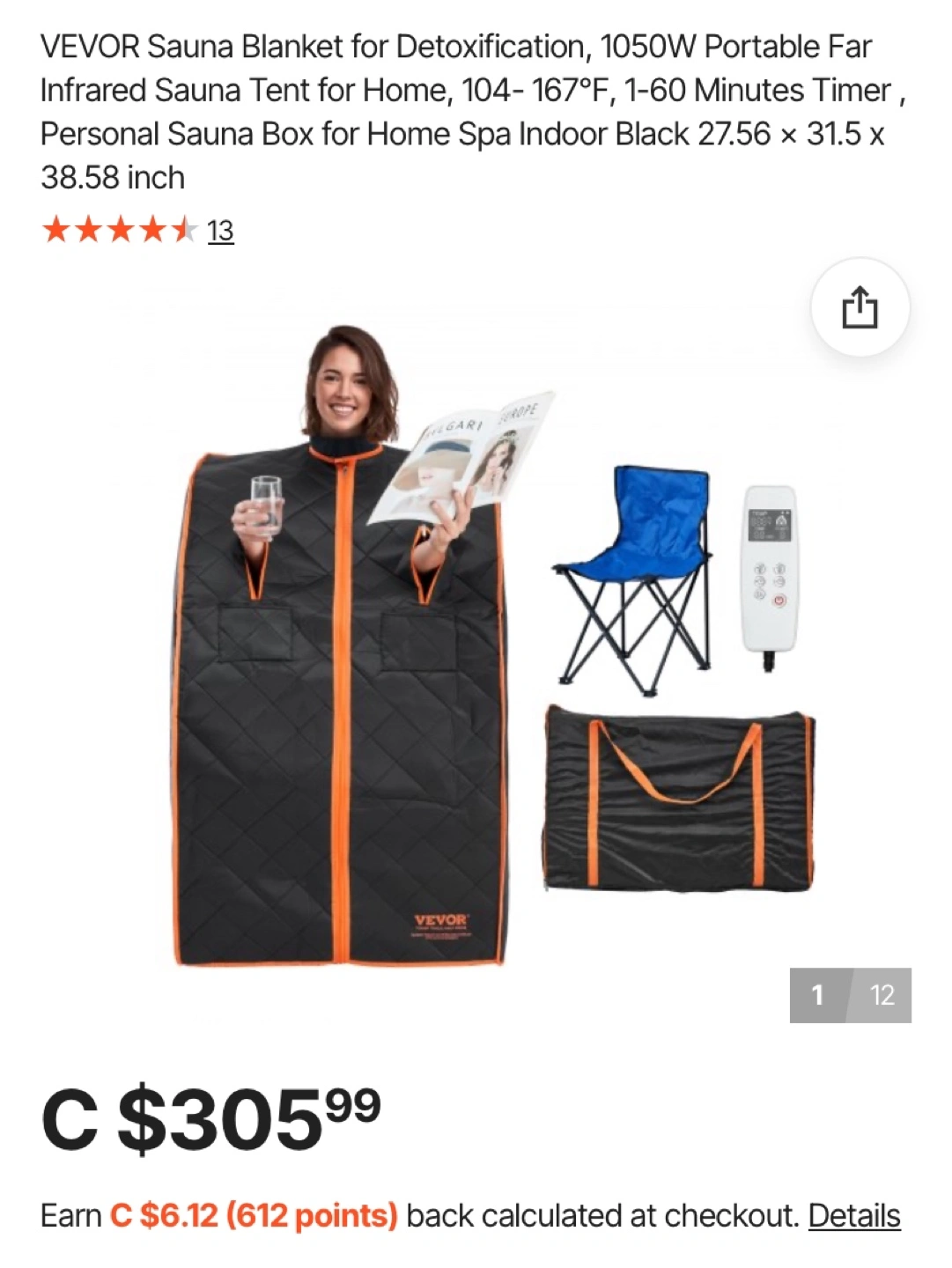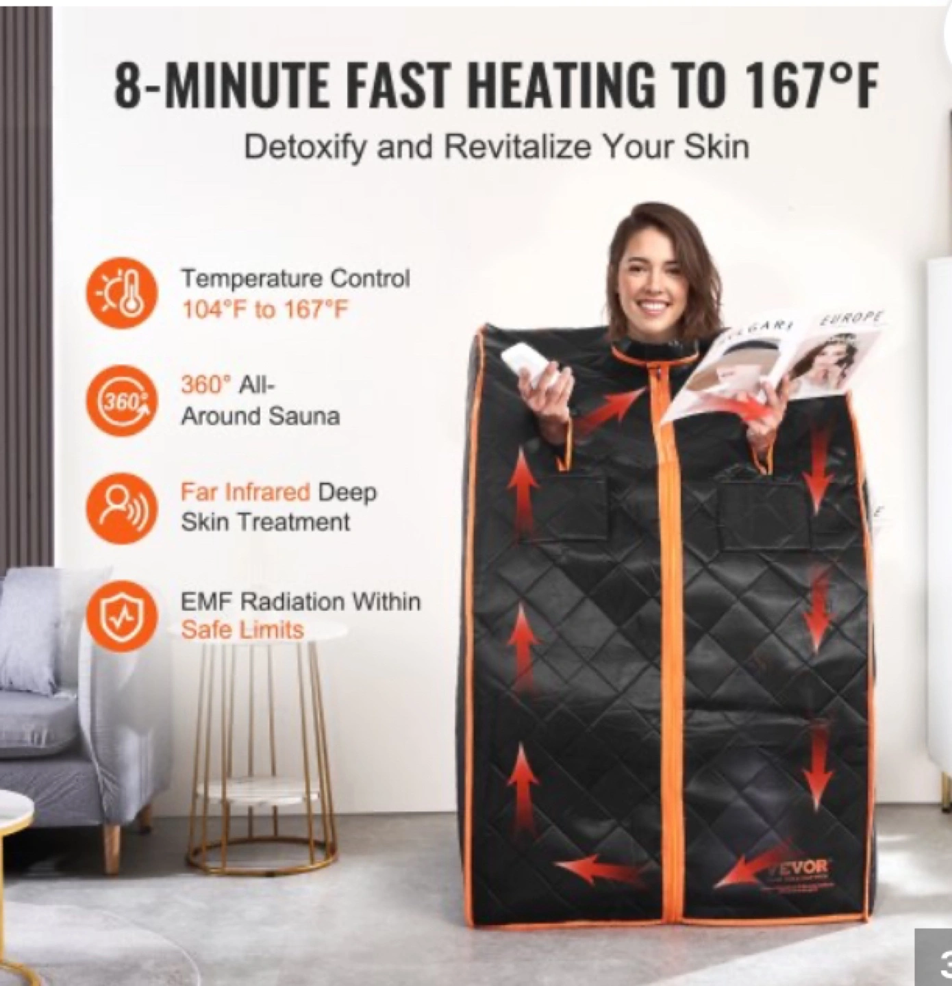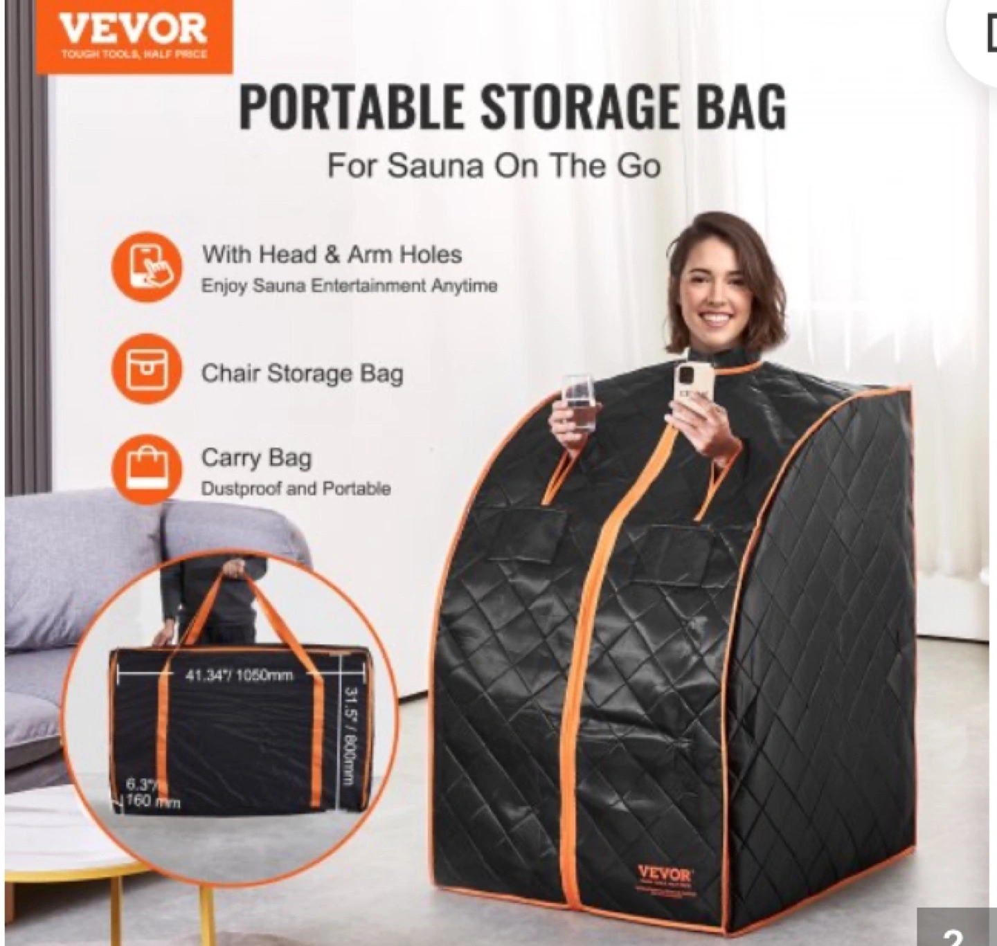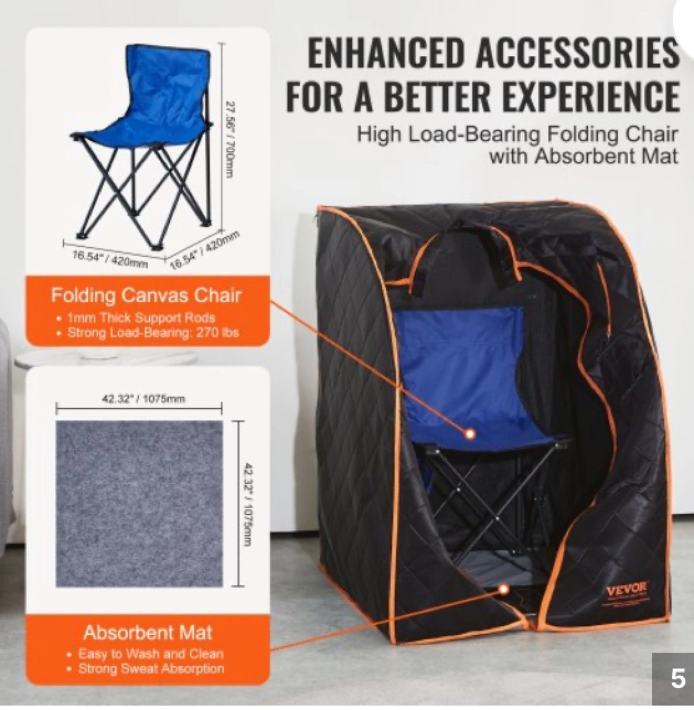 Personal sauna tent. Includes remote control, carrying bag, and folding chair. Features temperature and timer controls. Heated foot pad. Portable and easy to store.
